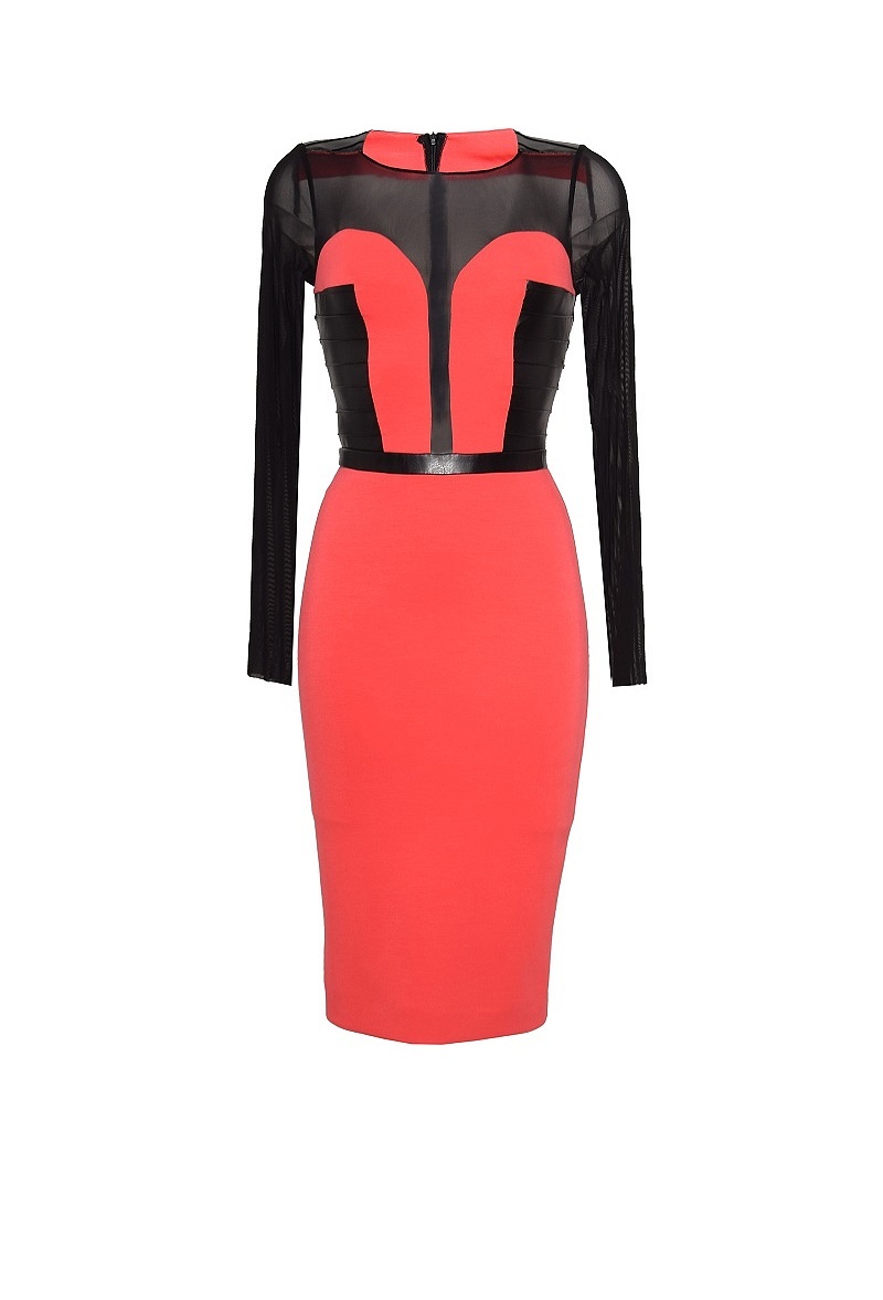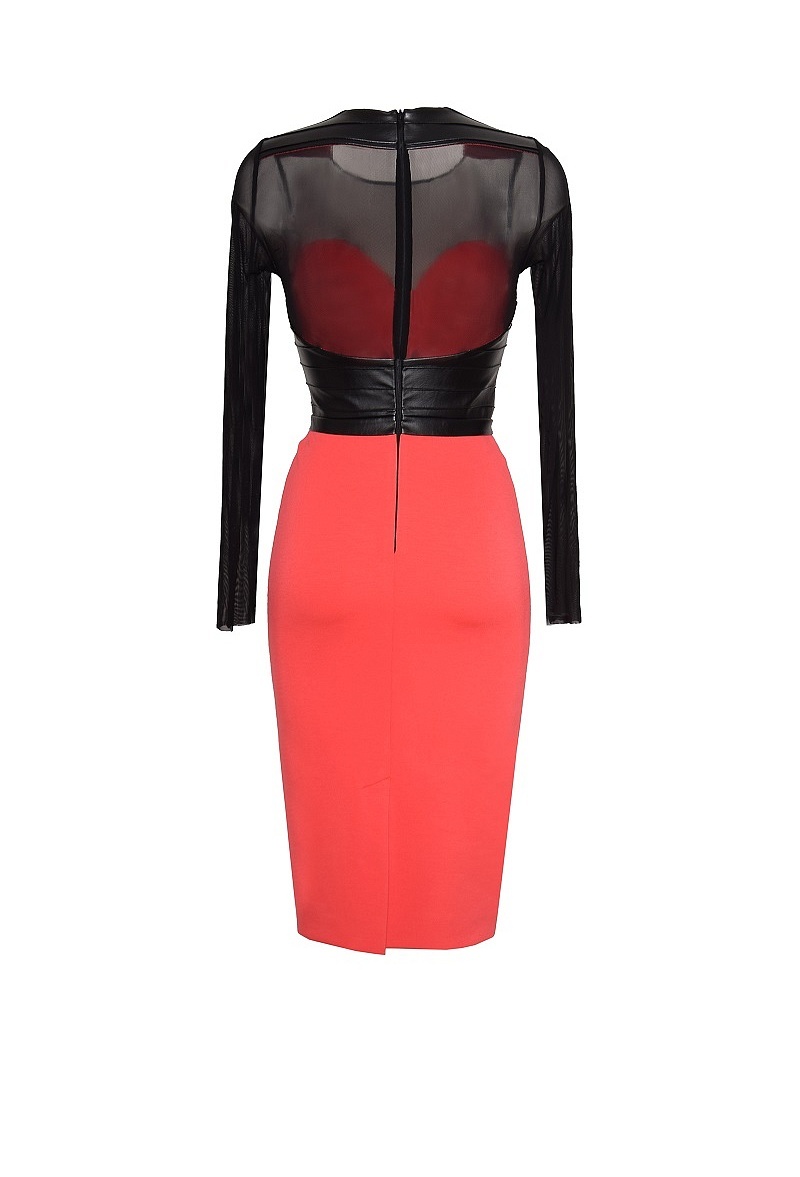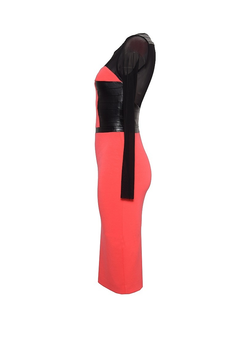Трикотажное платье футляр с вставками из экокожи. Рукава и кокетка из трикотажной сетки.