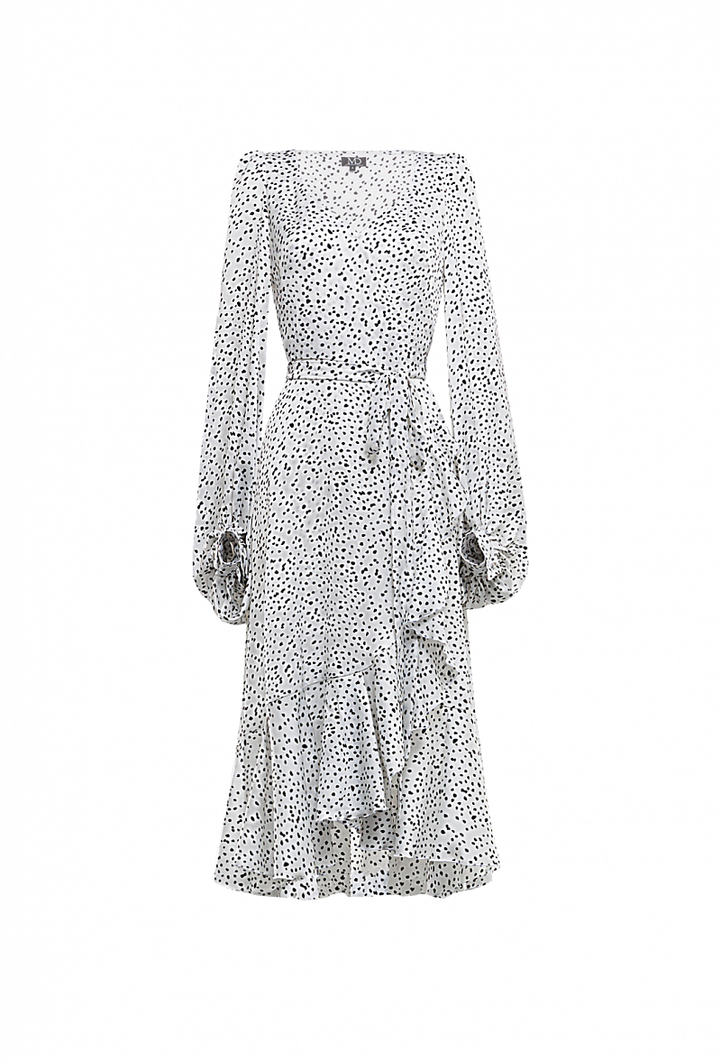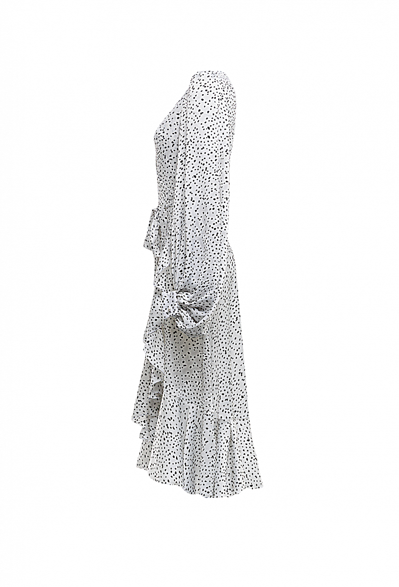 Платье-халат на запахе с широкими рукавами на манжетах. По краю юбки волан.