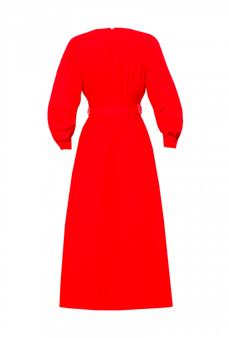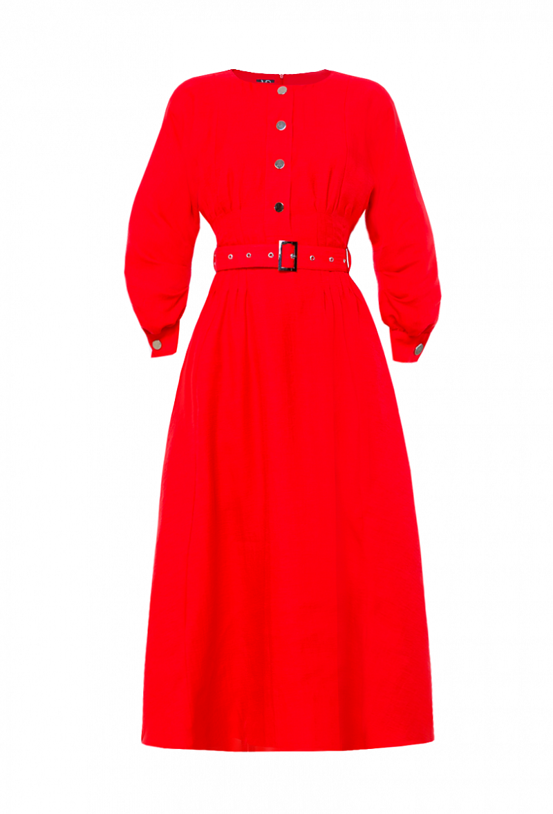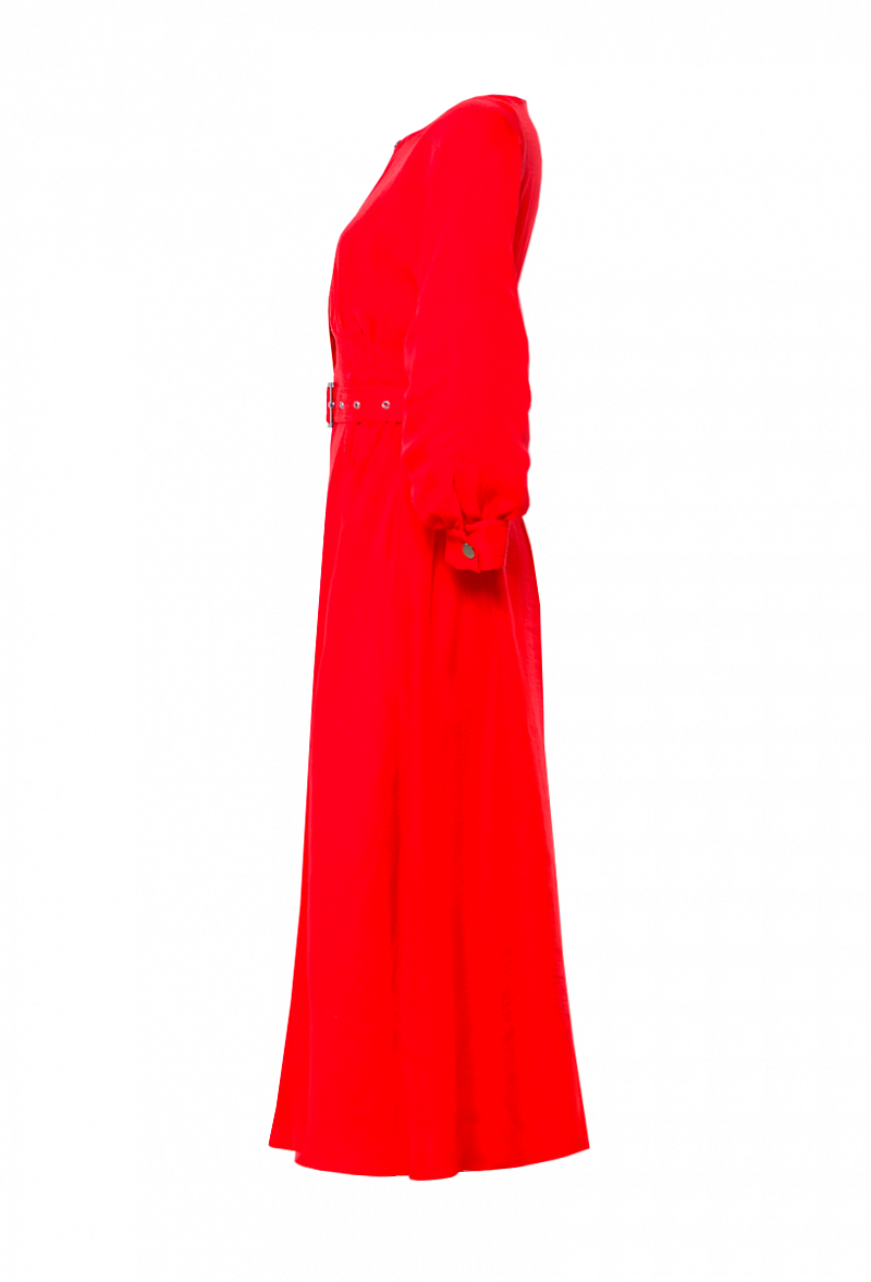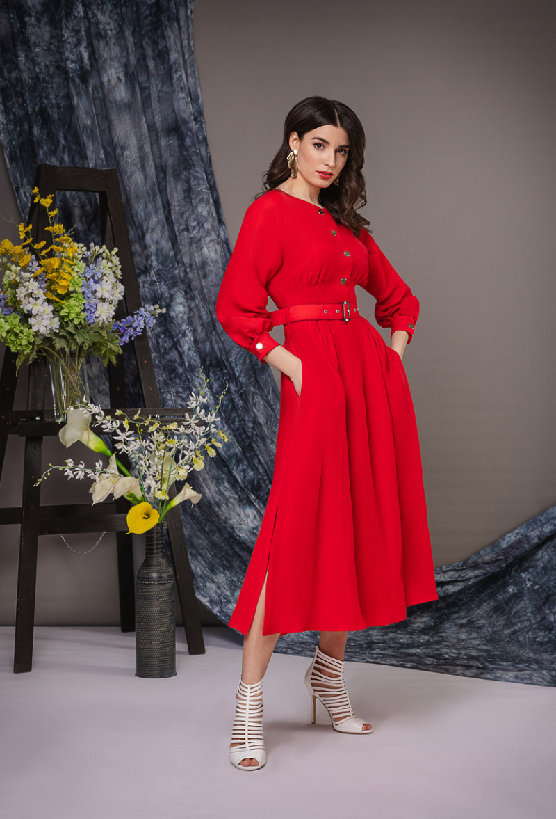 Платье приталенного силуэта, расклешённое по линии низа с разрезами по бокам, по линии талии сформированы вытачки-складки.