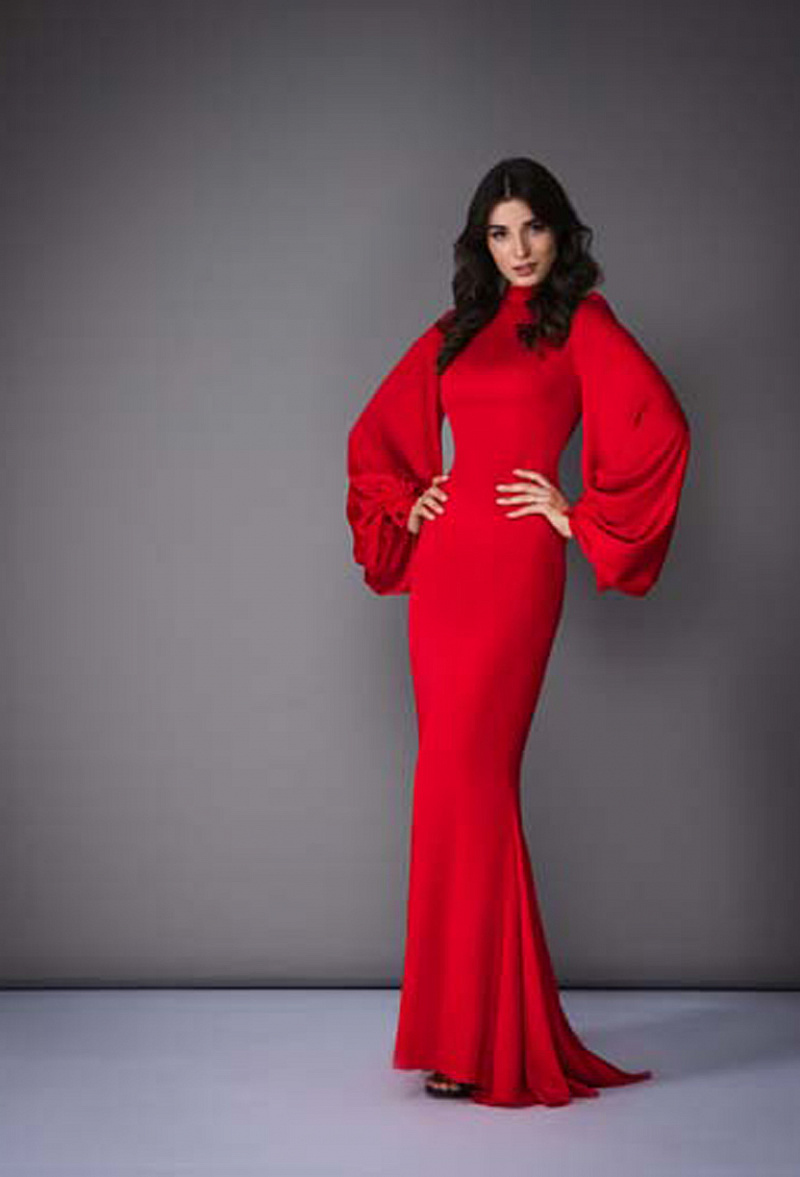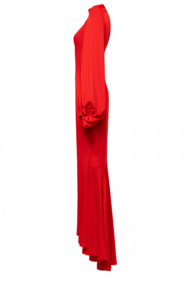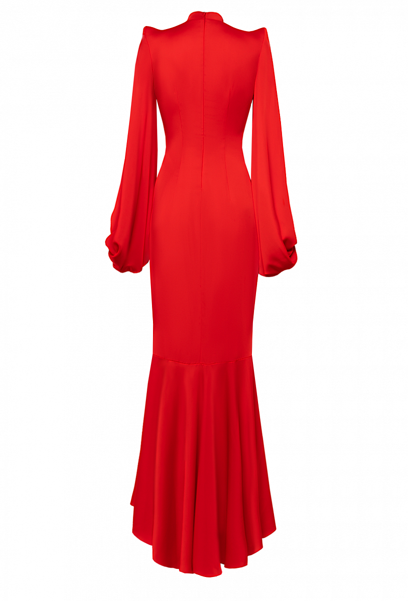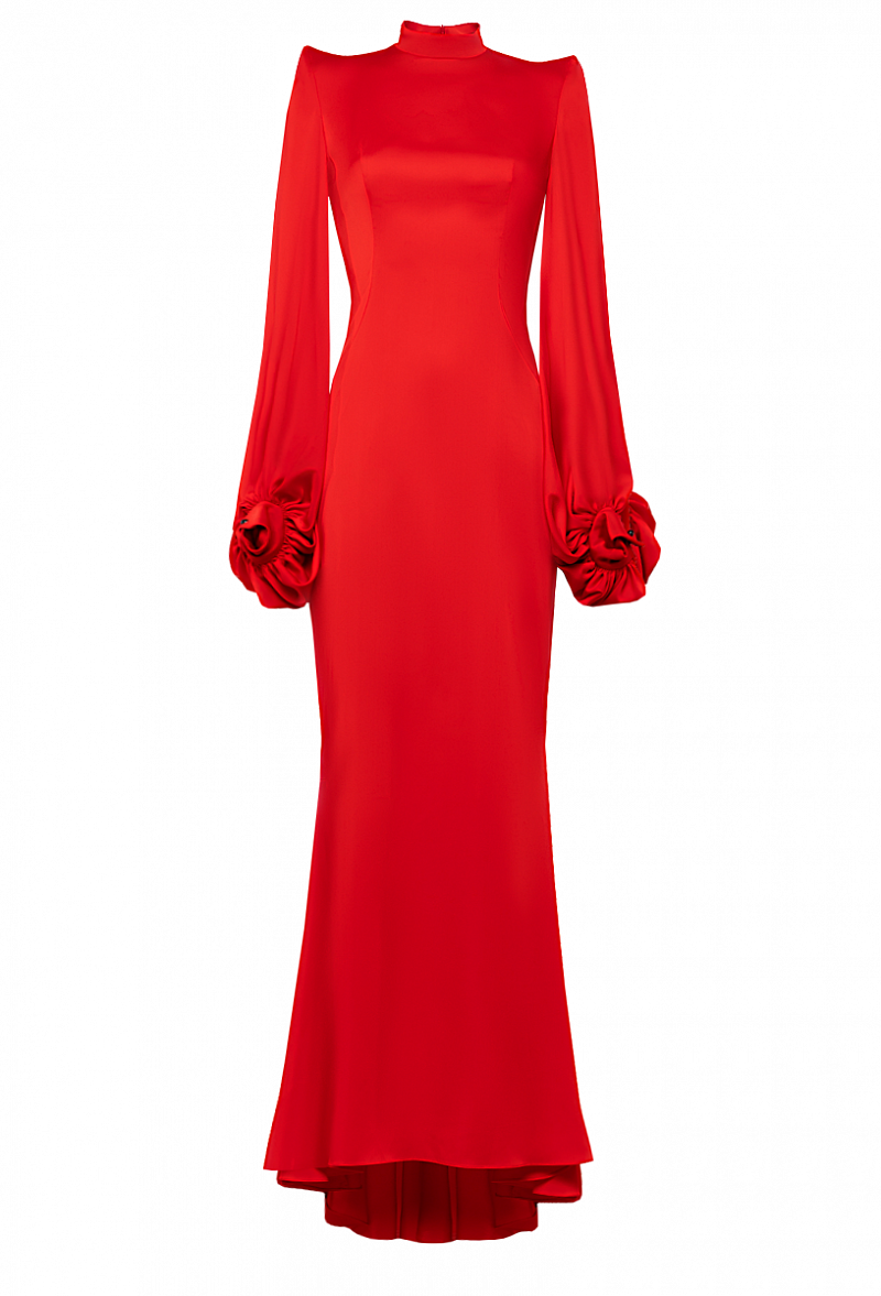 С воротником стойка, с высоким плечом и длинными рукавами в сборку на манжетах.