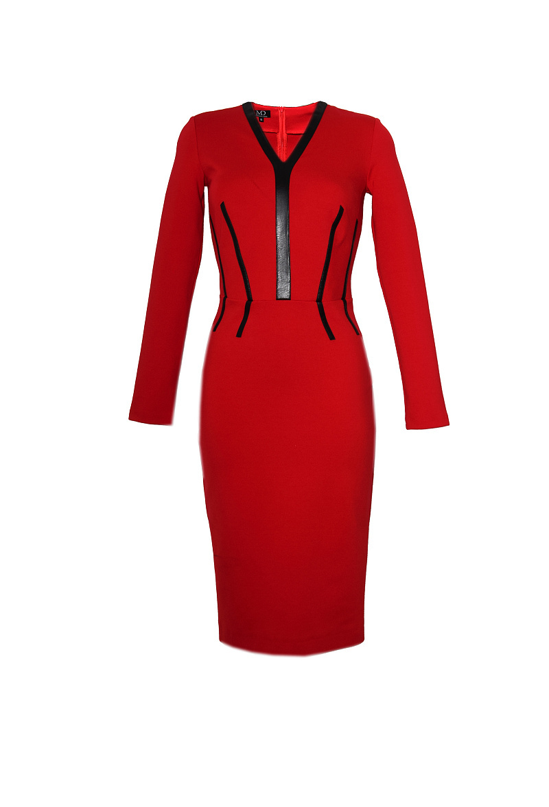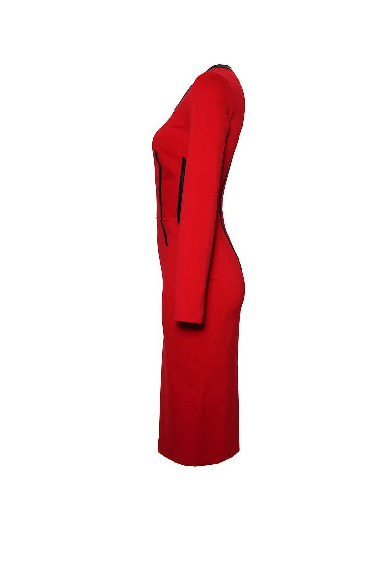 Красное платье длины миди с черными контрастными элементами, выполненными из экокожи.