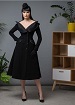 Платье-пиджак двубортное с воротником-шалькой. Глубокий декольтированный вырез декорирован «ушками». Пиджак на пуговицах с юбкой-четырёхклинкой. Чёрный