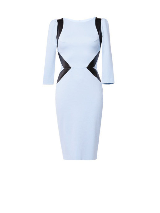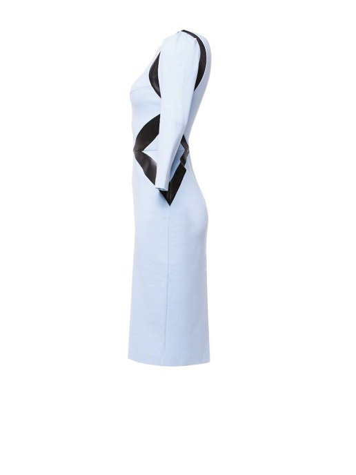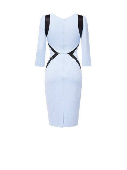 Платье футляр с геометрическими вставками из экокожи на полочке и юбке, юбка футляр
