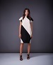Платье прямого кроя с графическими контрастными вставками, закрытым воротником и коротким рукавом, бежевый, коричневый