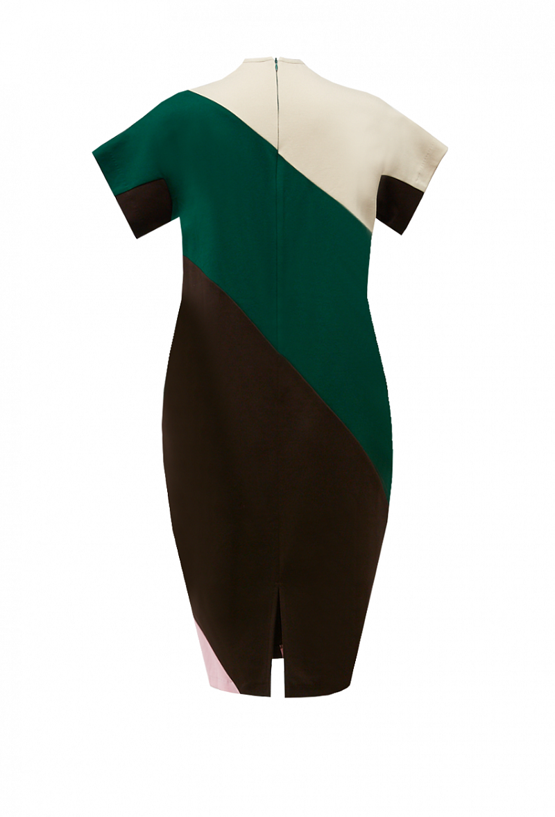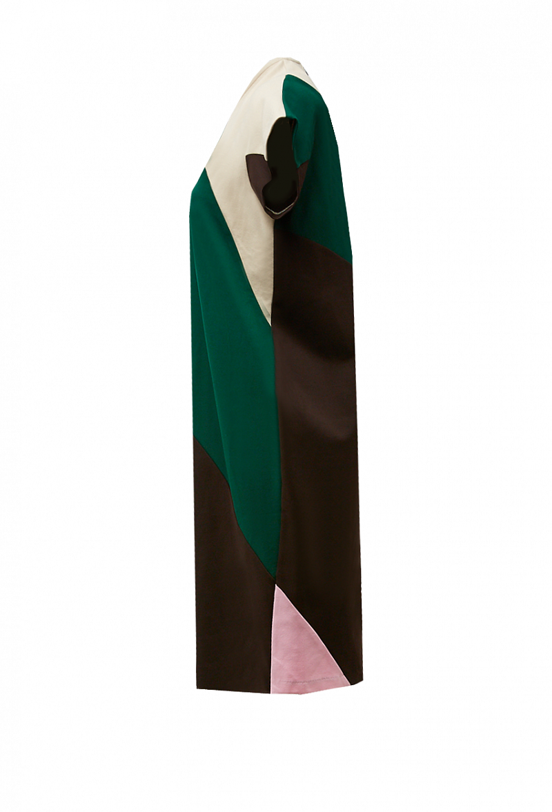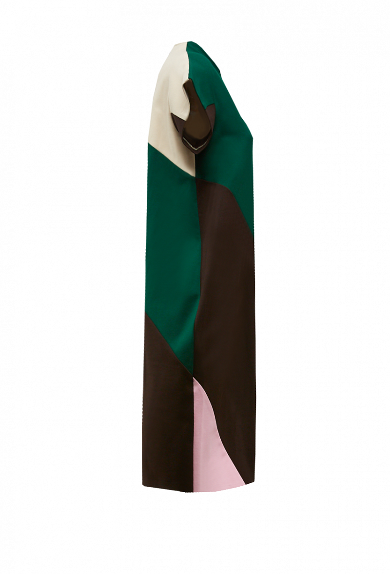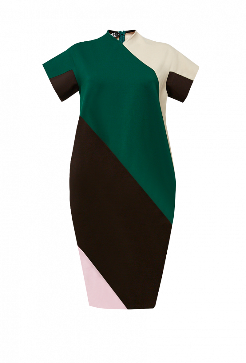 Платье прямого кроя с графическими контрастными вставками, закрытым воротником и коротким рукавом
