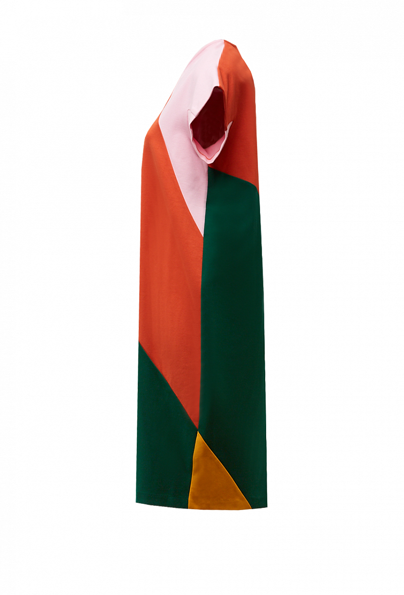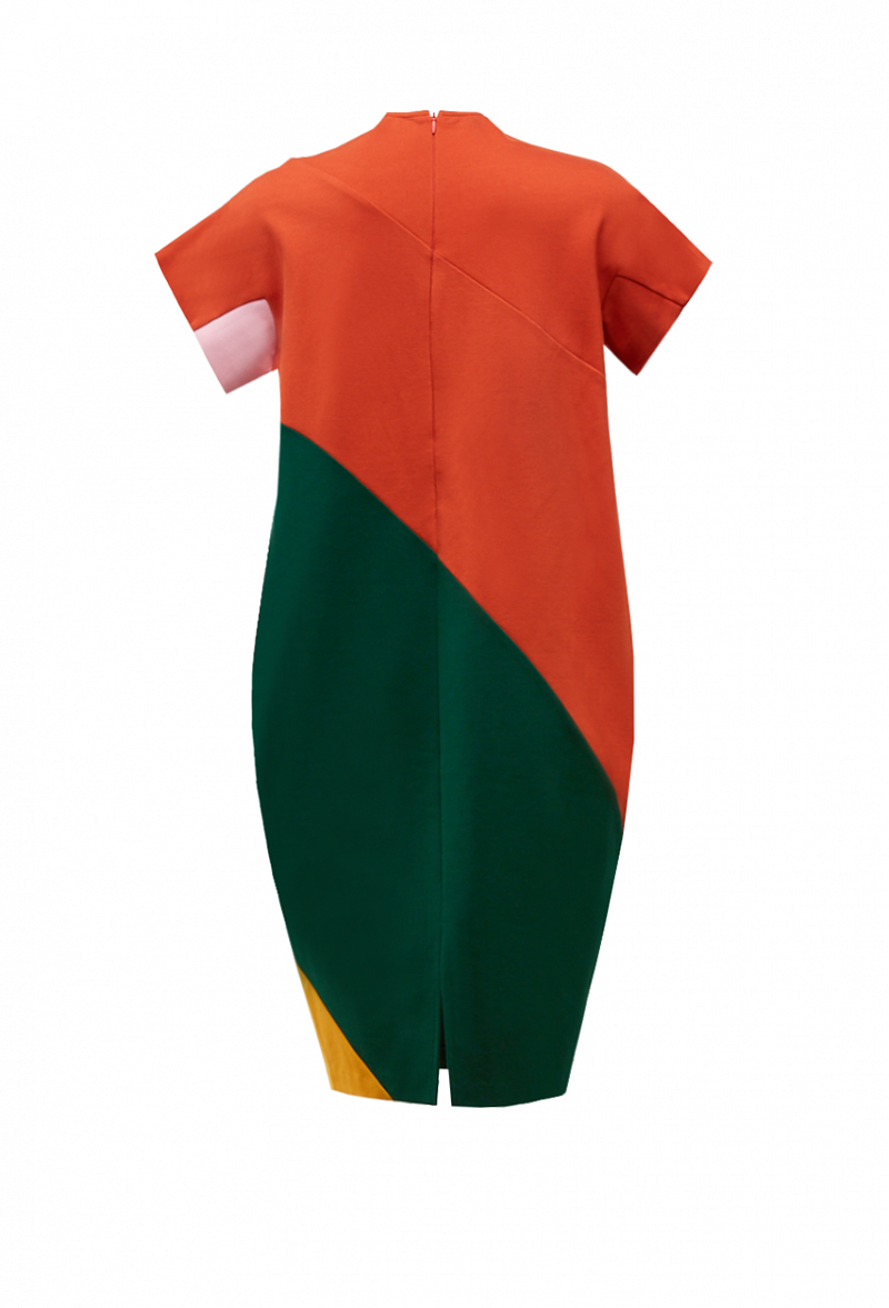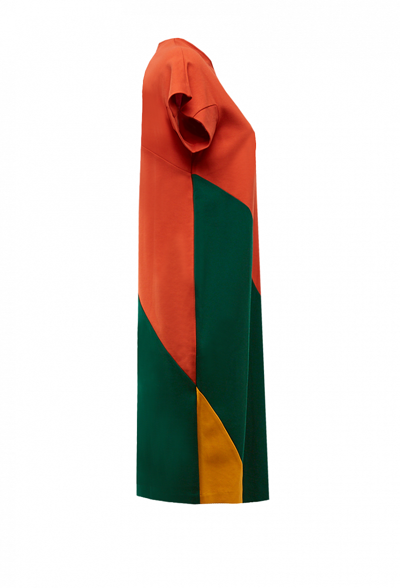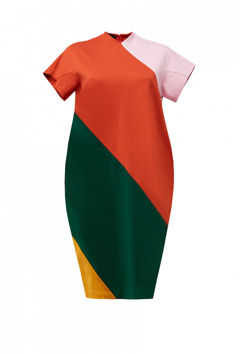 Платье прямого кроя с графическими контрастными вставками, закрытым воротником и коротким рукавом