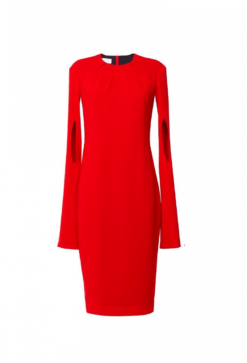Платье прямого кроя со складками на горловине, опущенными рукава с прорезями в области локтей
