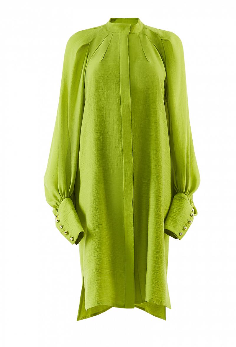 Платье - рубашка с потайной планкой(застежкой), с рукавом - реглан и высоким манжетом, с двумя разрезами по бокам.