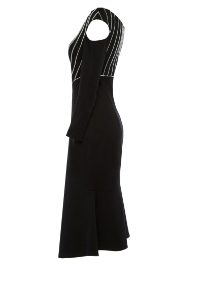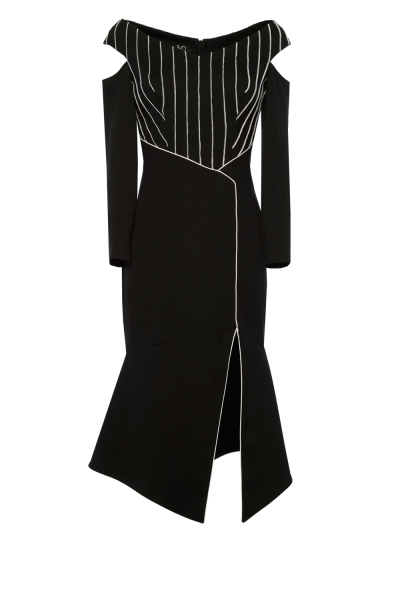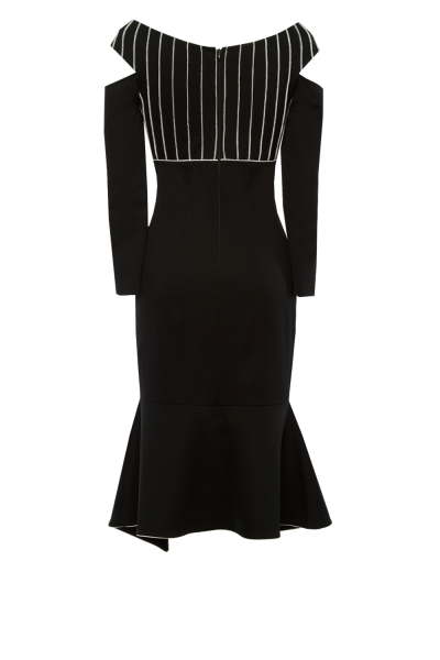 Платье с ассиметричным воланом, декоративные отстрочки контрастными нитками, V-образная горловина, открытые плечи