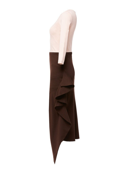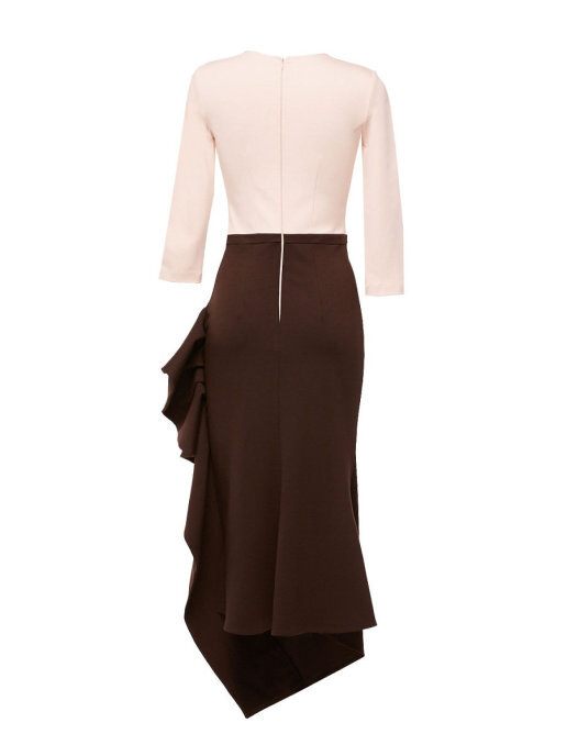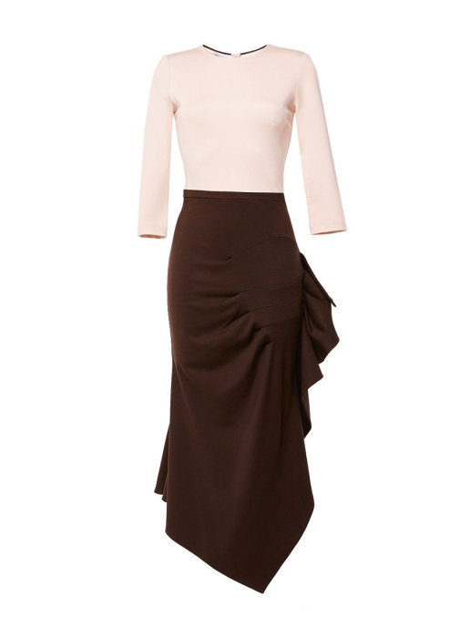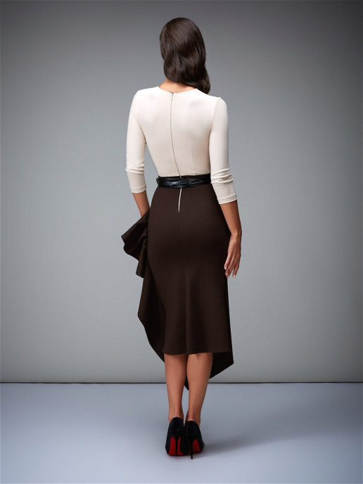 Платье облегающего силуэта с рукавом 3/4, юбка годе до середины икры с ассиметричными защипами на боку.
