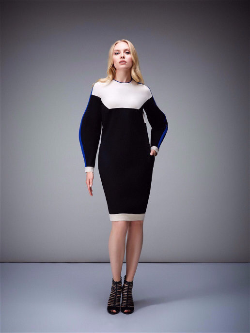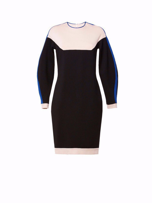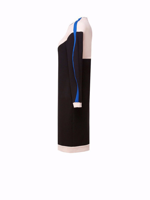 Платье трехцветное, прямого кроя с манжетами на руках и по низу изделия, фигурным рукавом с контрастным лампасом