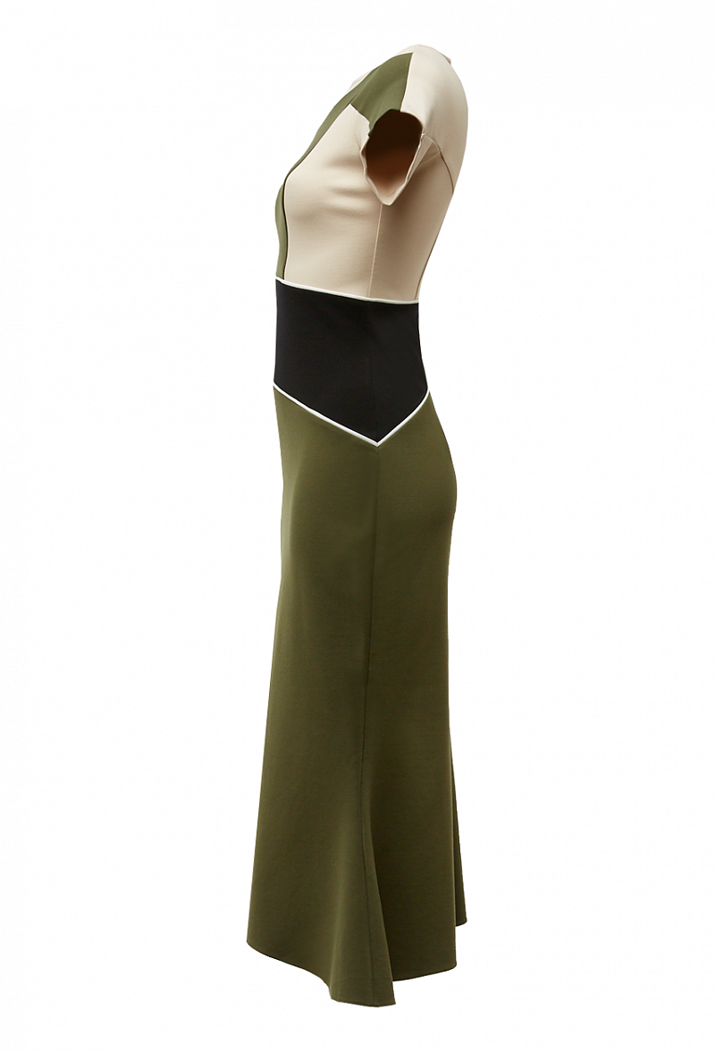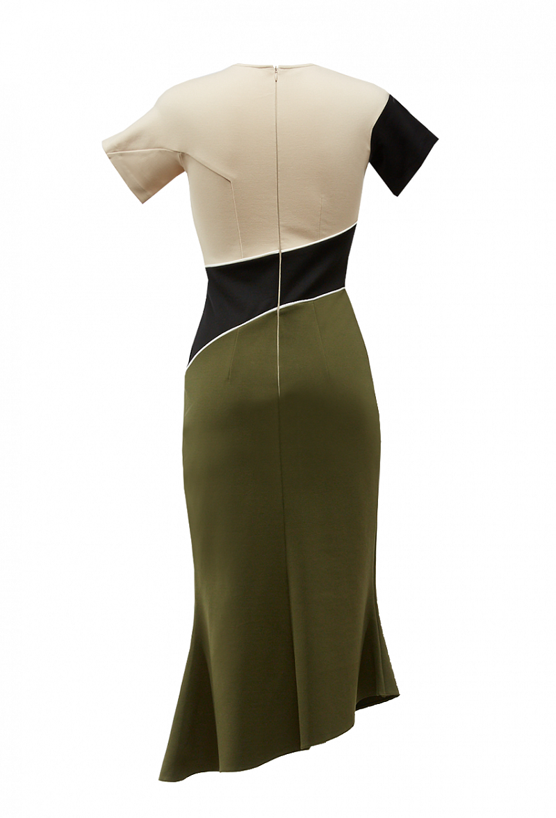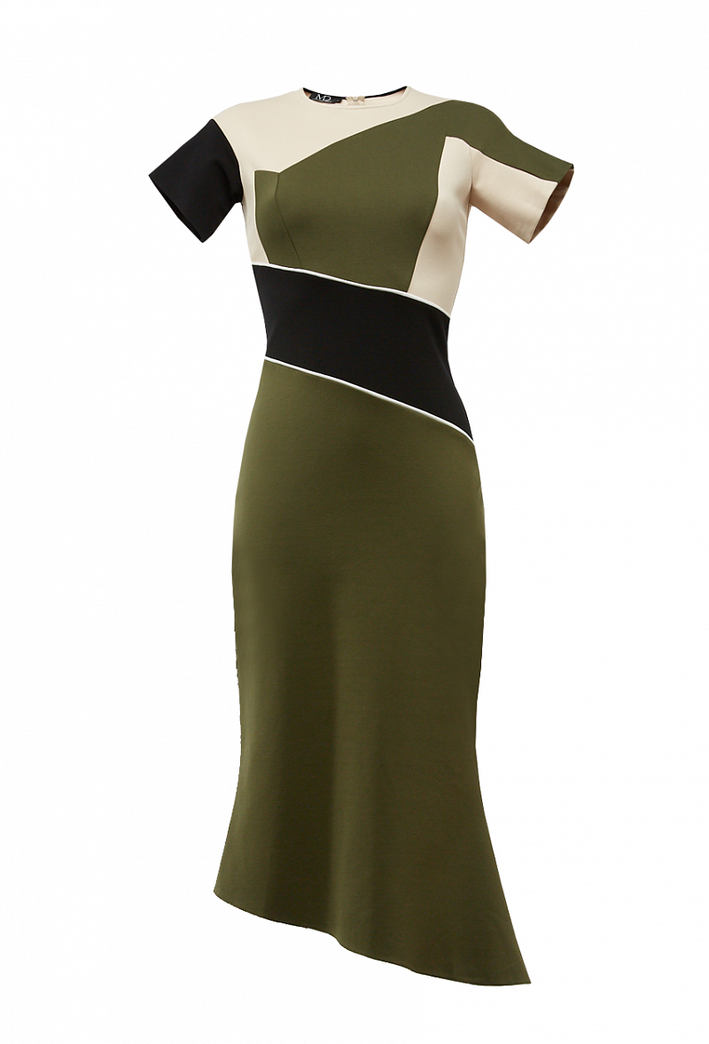 Платье с коротким рукавом, графическими контрастными вставками на кокетке по линии талии и ассиметричной юбке
