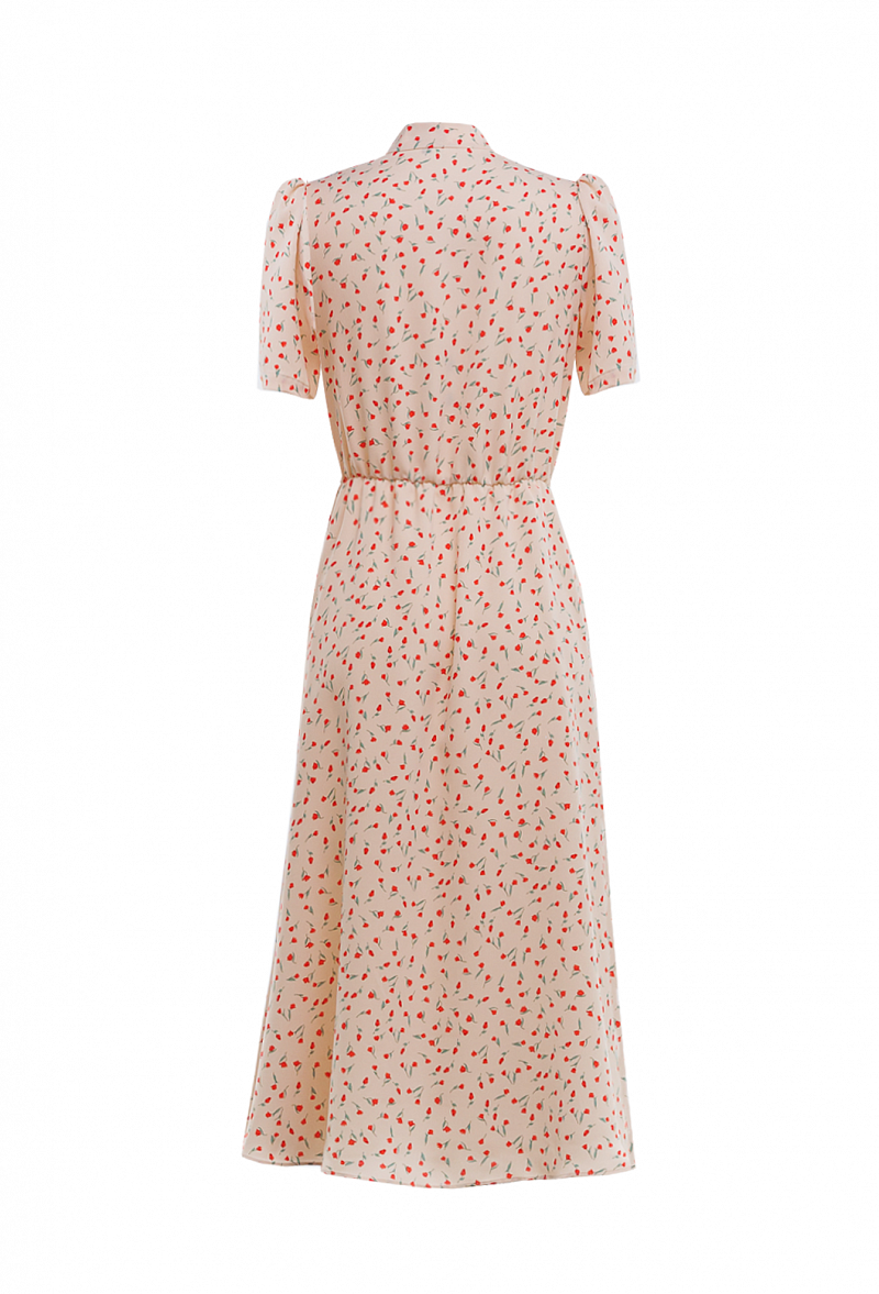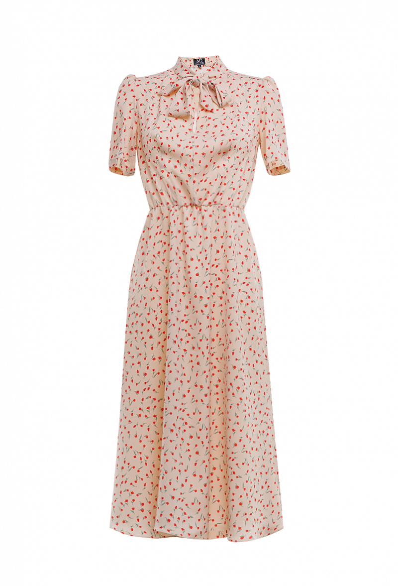 Платье с коротким рукавом, воротник стойка переходящая в бант. Юбка расклешенная, с резинкой по талии. Длина миди. Ткань с мелким принтом.