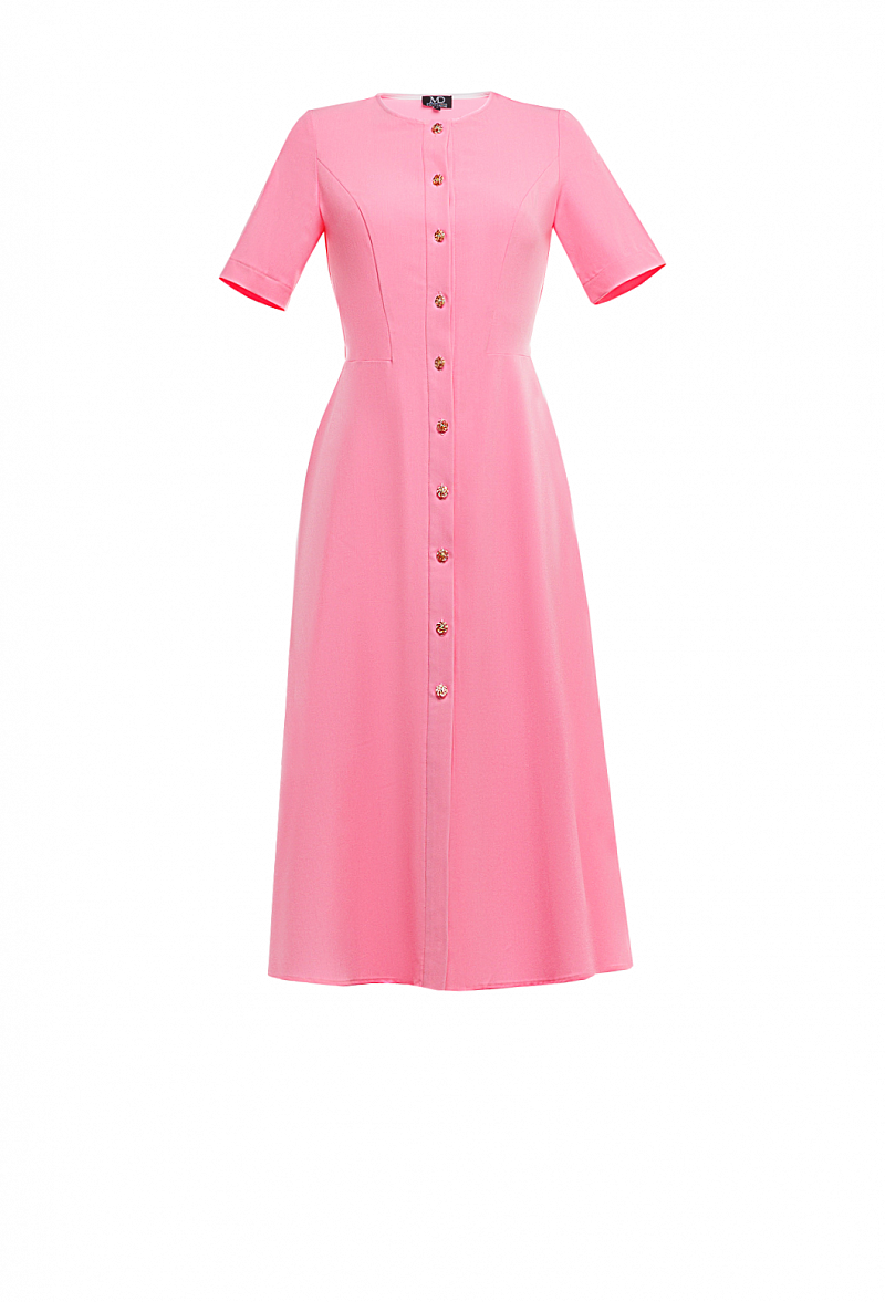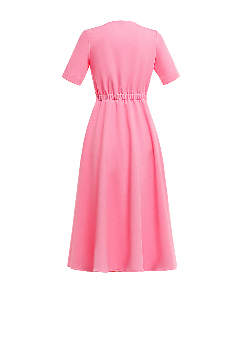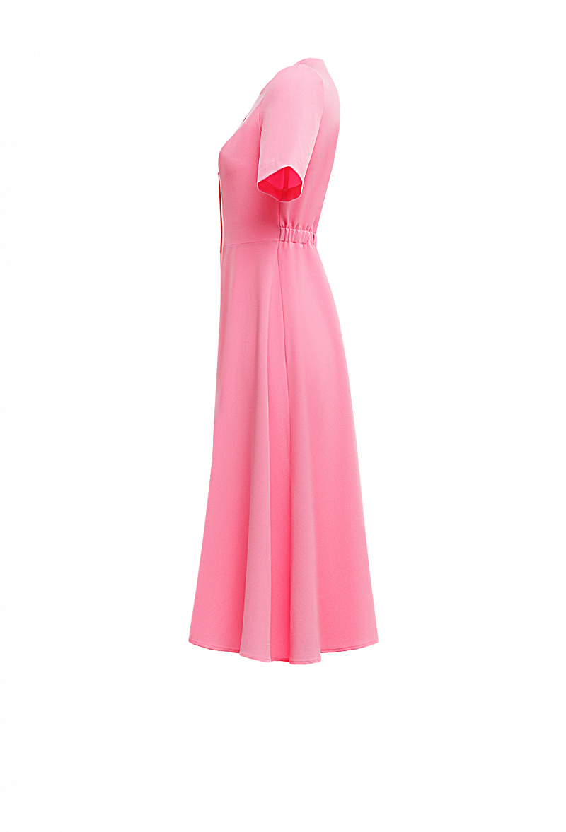 Платье с коротким рукавом на пуговицах розовое. Подрезными бочками и кулиской. Длина миди.