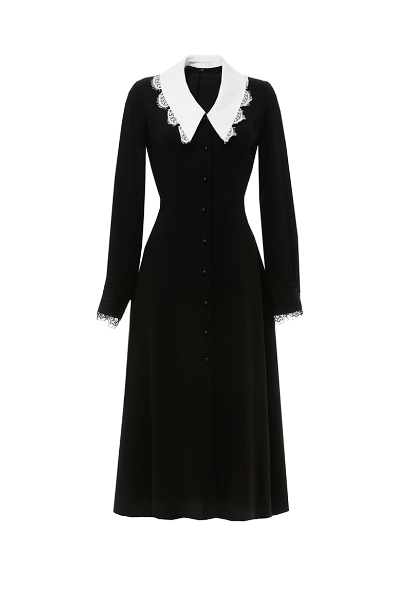 Платье на пуговицах-жемчужинах с кружевными воротником и манжетами.