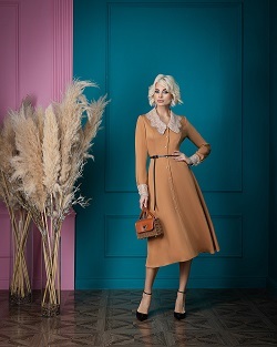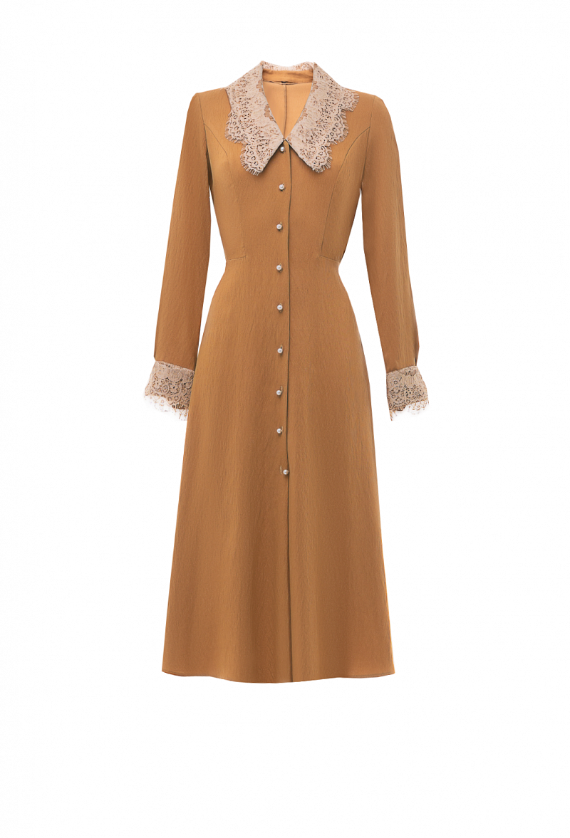 Платье на пуговицах-жемчужинах с кружевными воротником и манжетами.