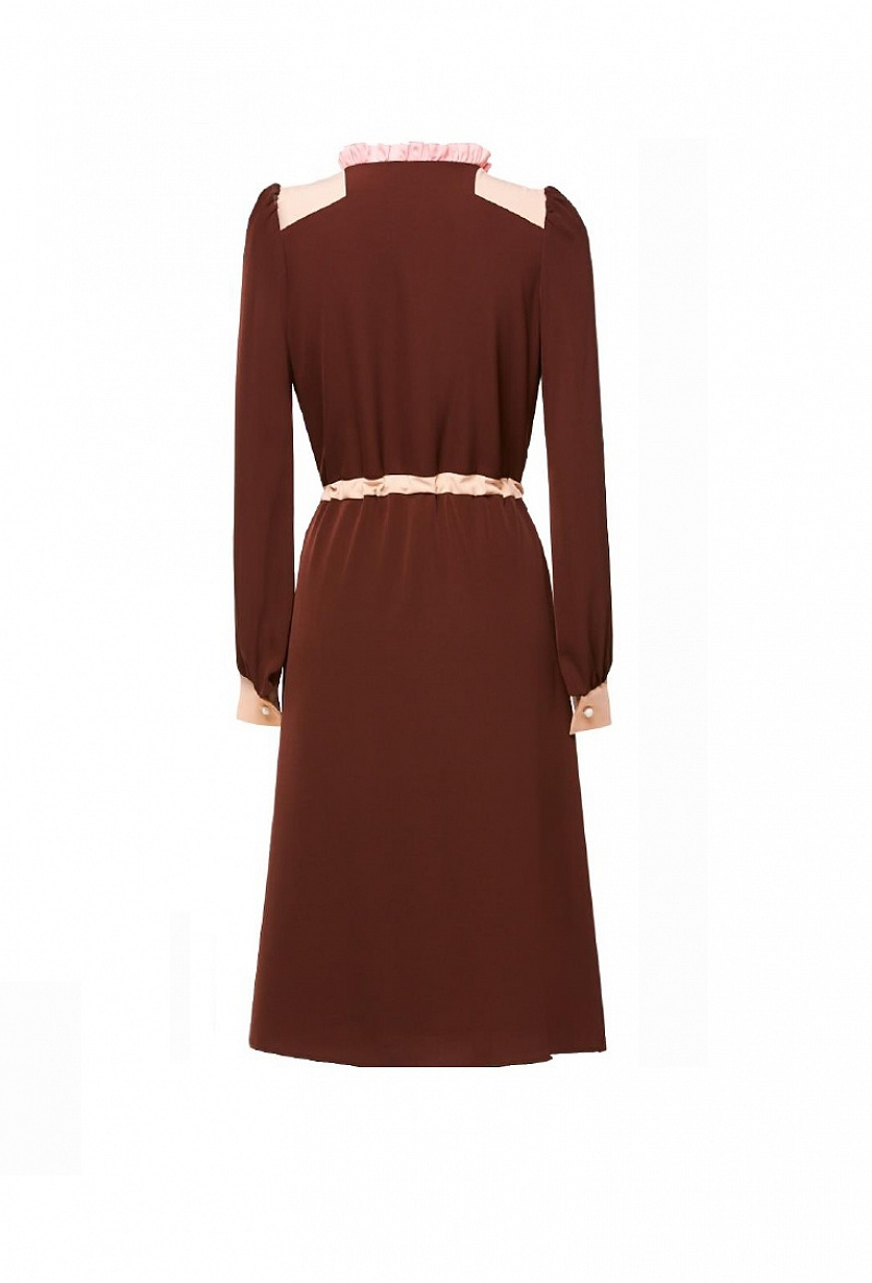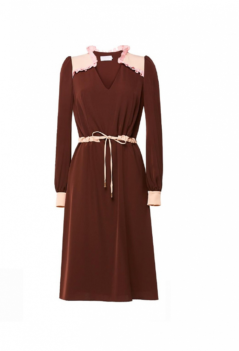 Платье с кулиской, кокеткой на полоске с рюшками, юбкой трапеция, рукавами с манжетами.