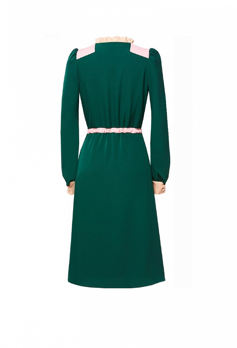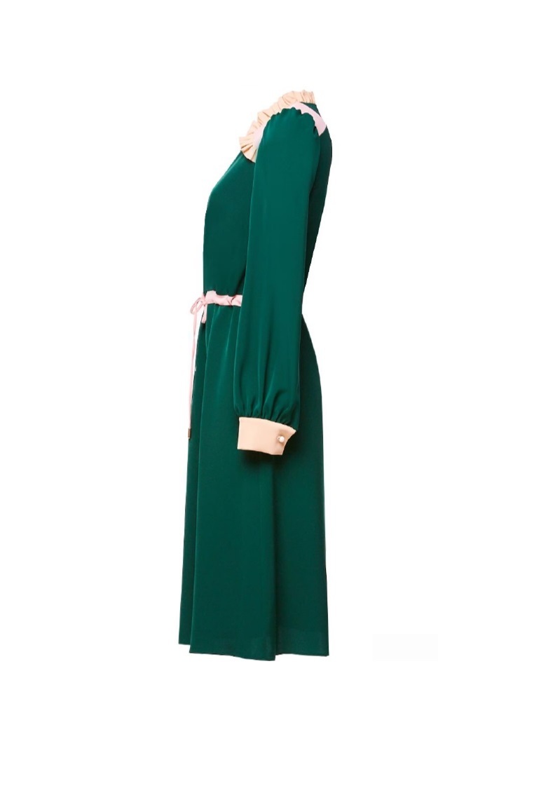 Платье с кулиской, кокеткой на полоске с рюшками, юбкой трапеция, рукавами с манжетами.
