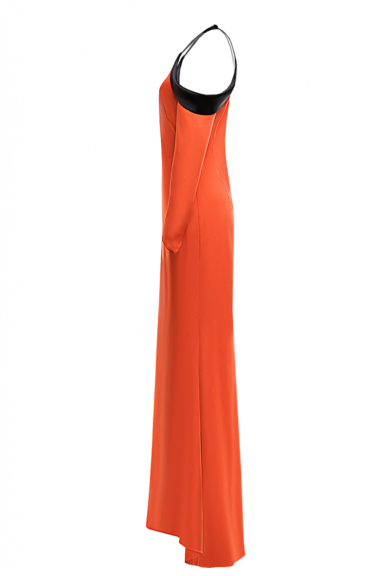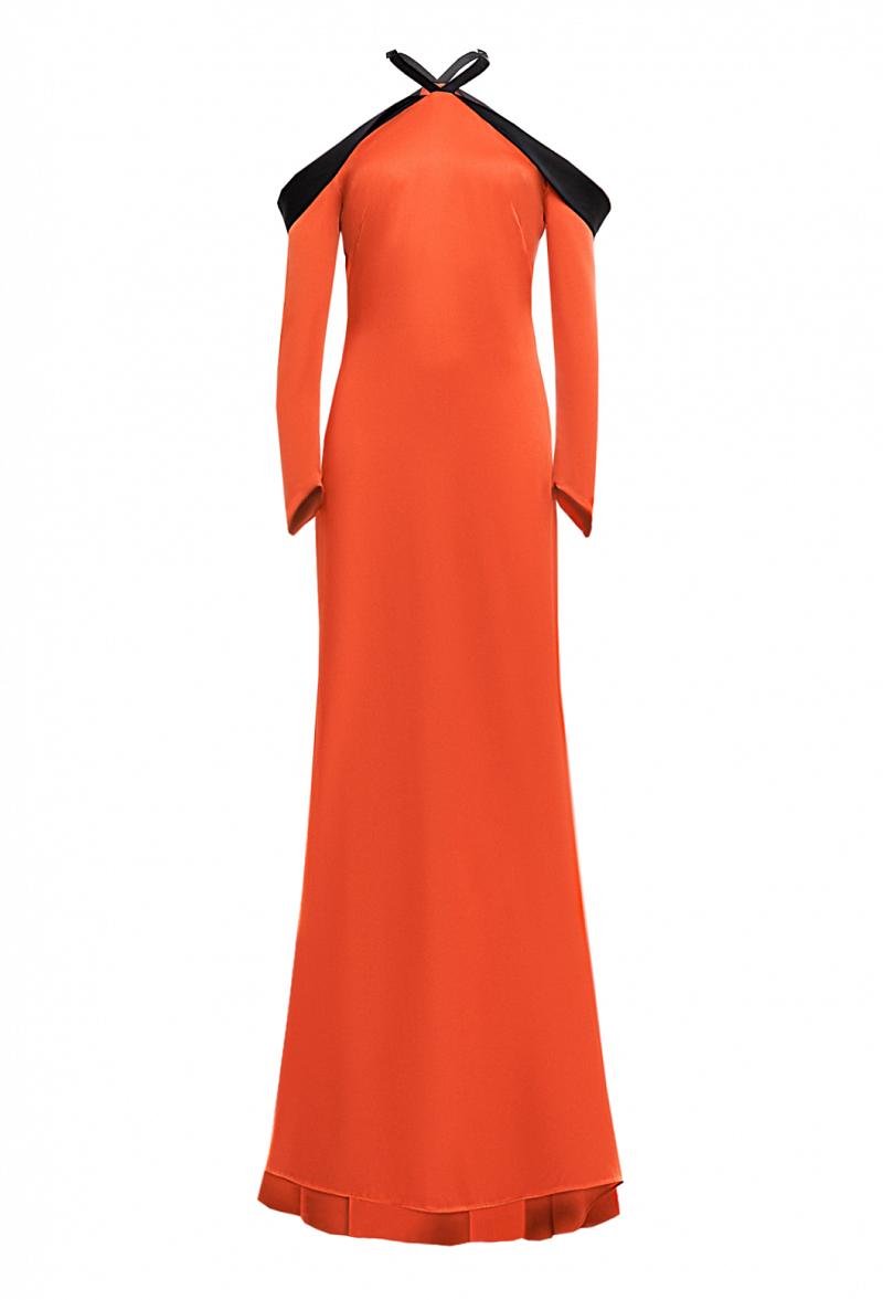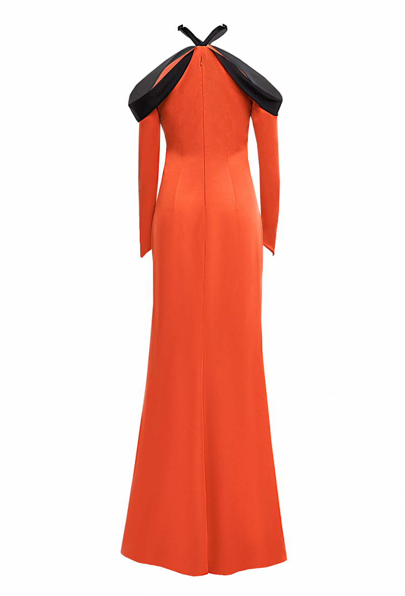 Платье в пол с открытыми плечами и длинными рукавами. По плечам отделка из черной ткани в виде воротника. Застежкой на шее и молнии на спинке.