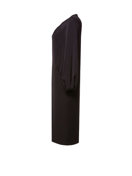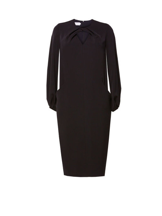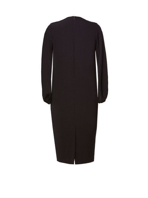 Платье прямого кроя со складками на V образной горловине, карманами, со складками в нижней части рукава и манжетами.