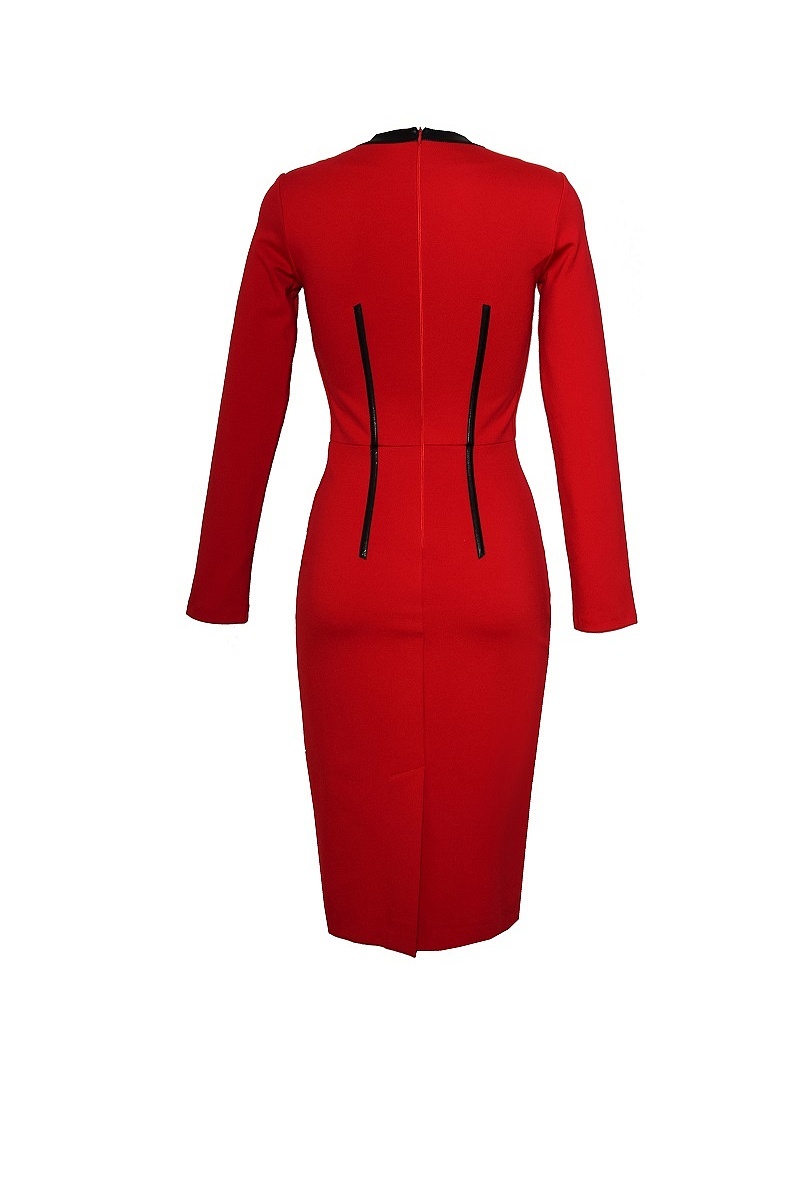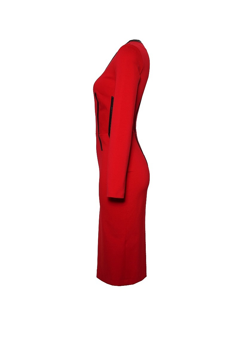 Трикотажное платье с длинным рукавом и вертикальными вставками из экокожи.