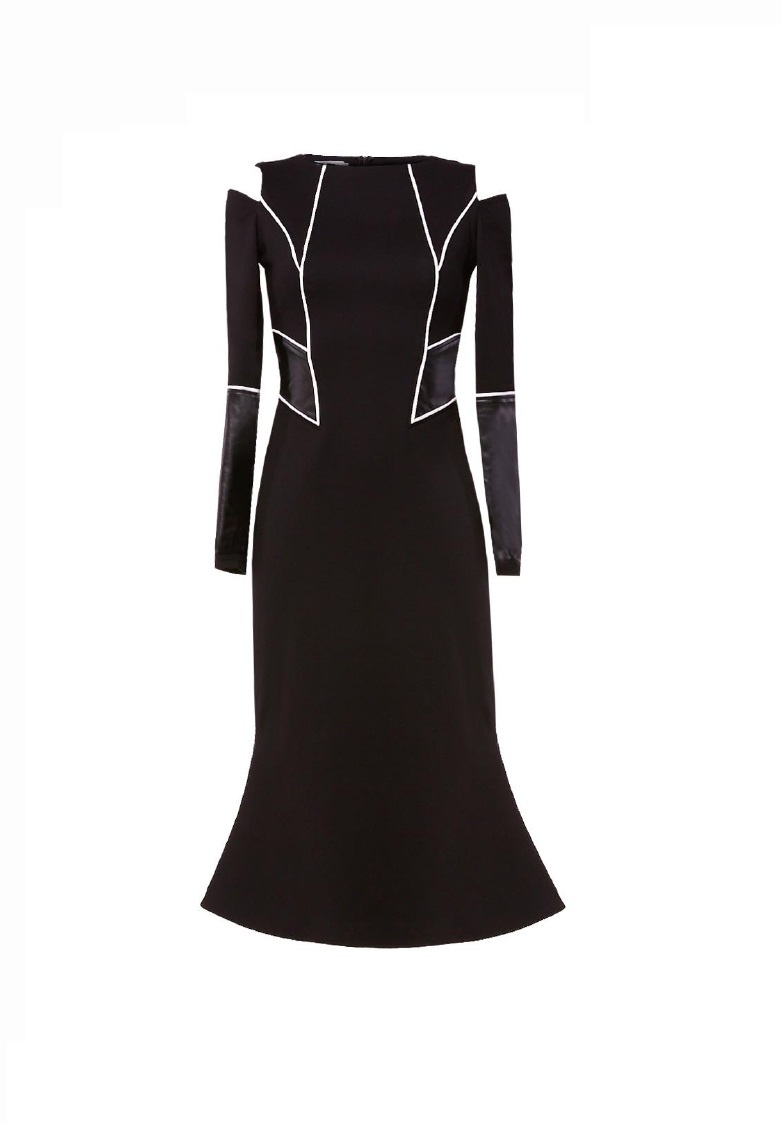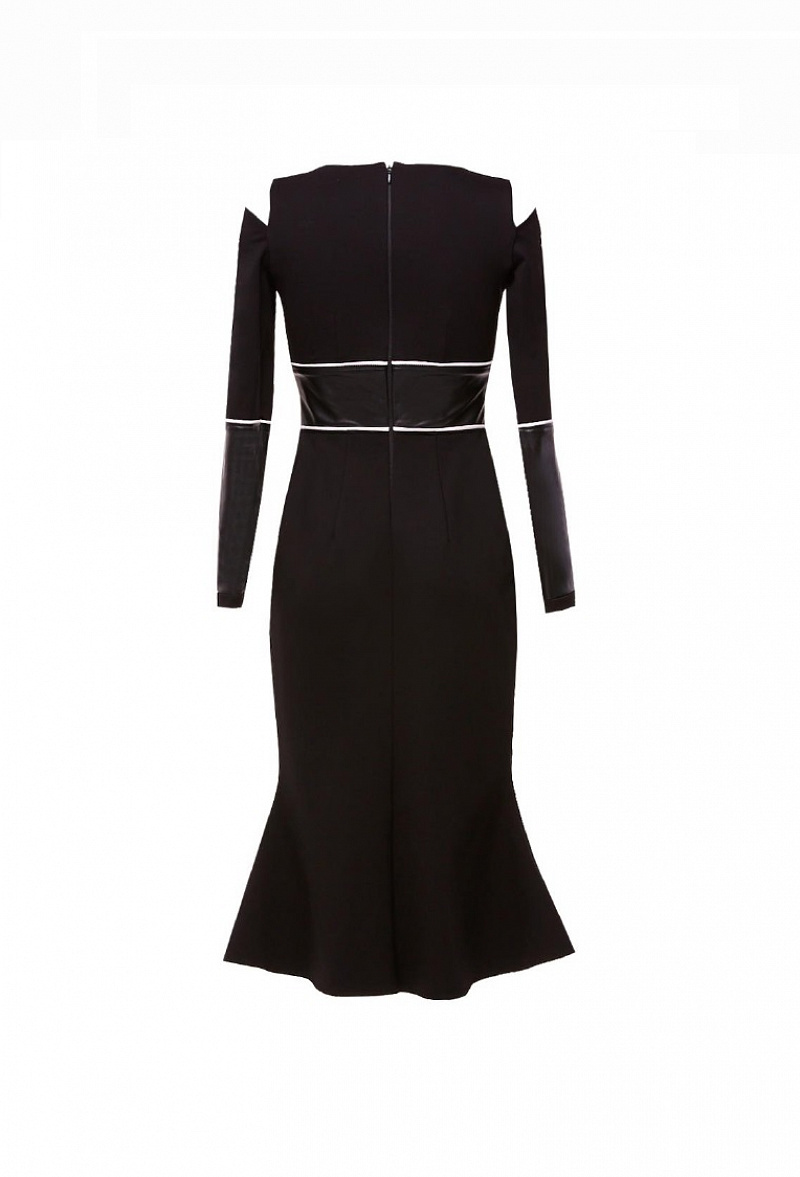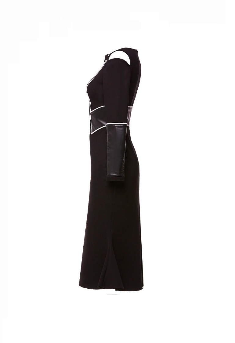 Платье с юбкой годе, геометрическими вставками в т.ч. из экокожи, прорезями на головке рукава