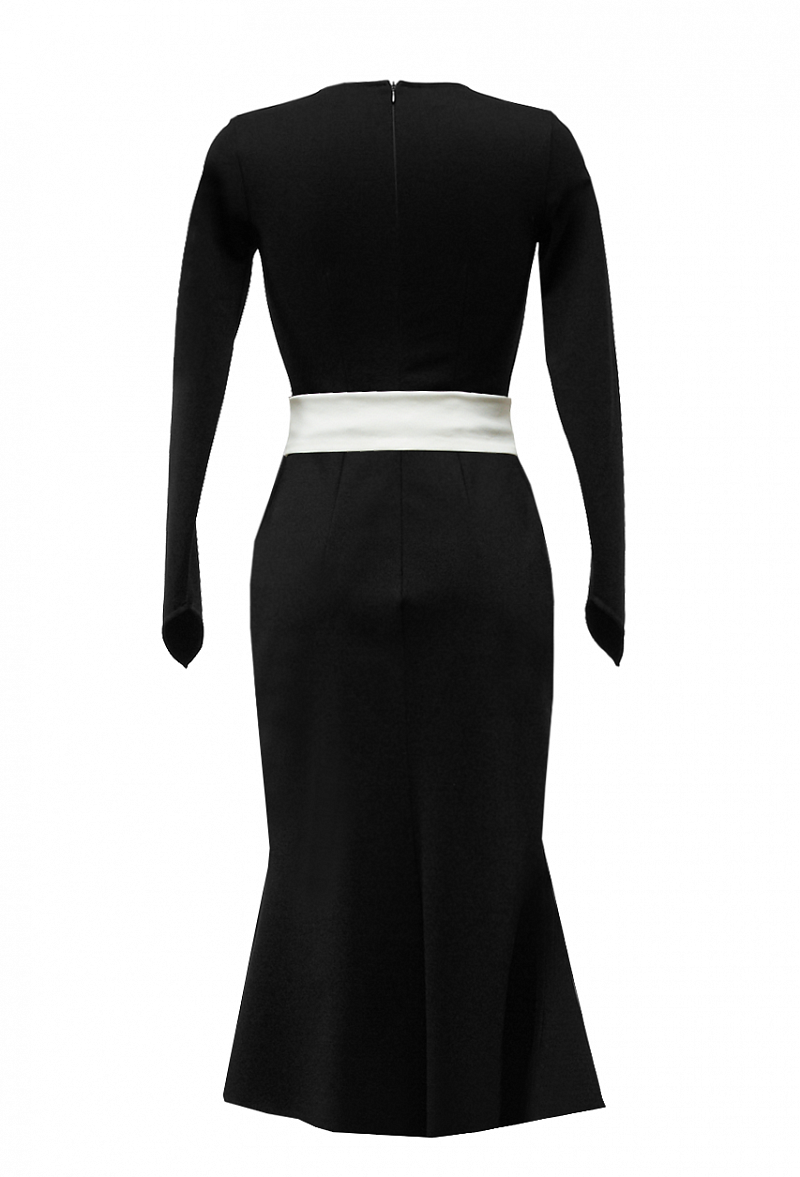 Платье с юбкой годе, V-образным вырезом горловины, втачным рукавом, защипами на талии и юбке.
