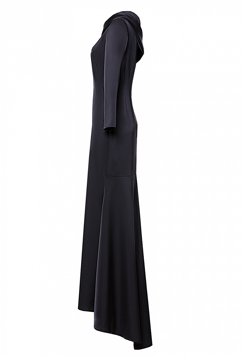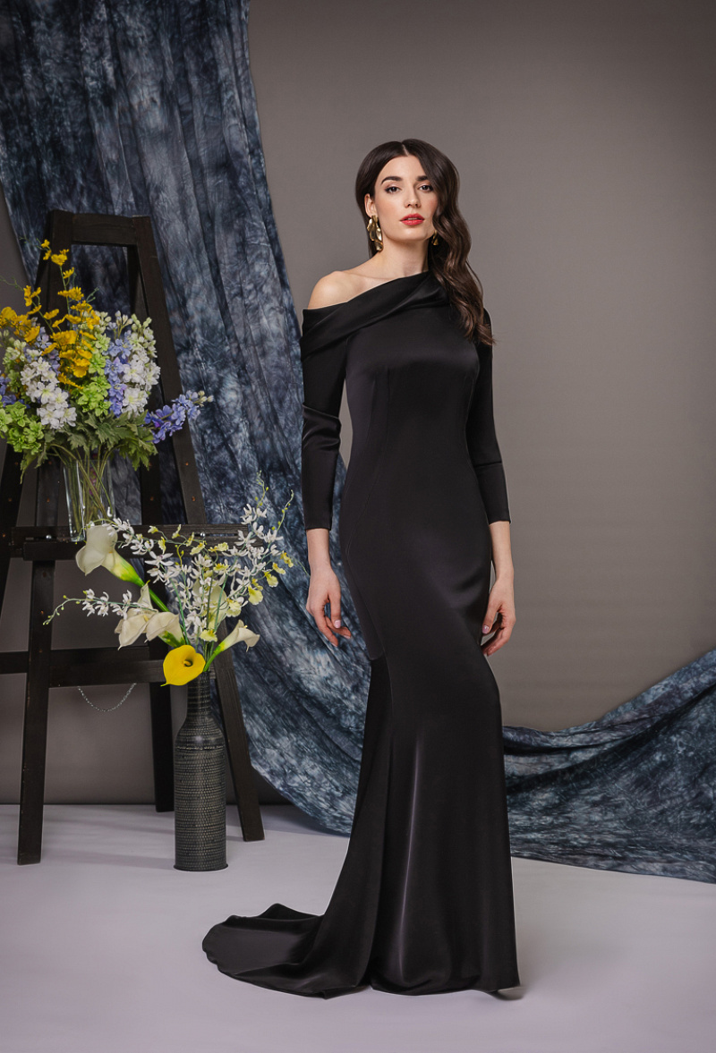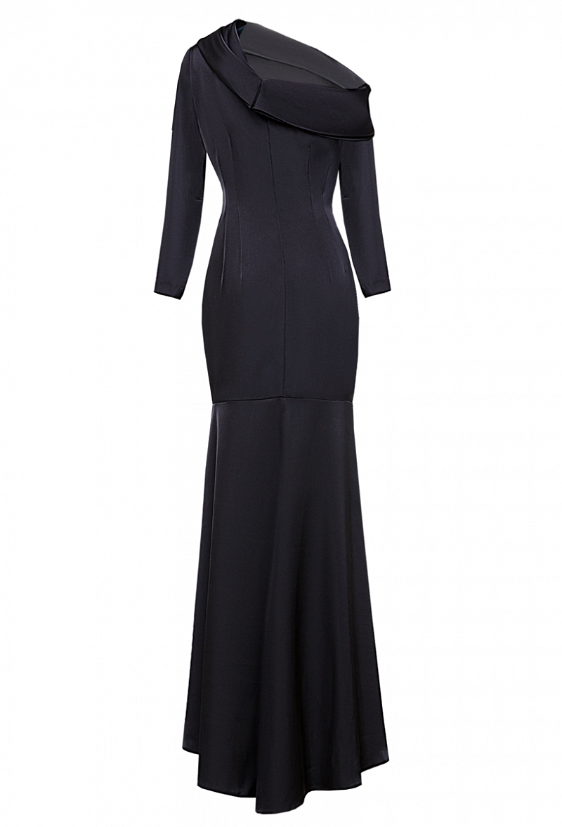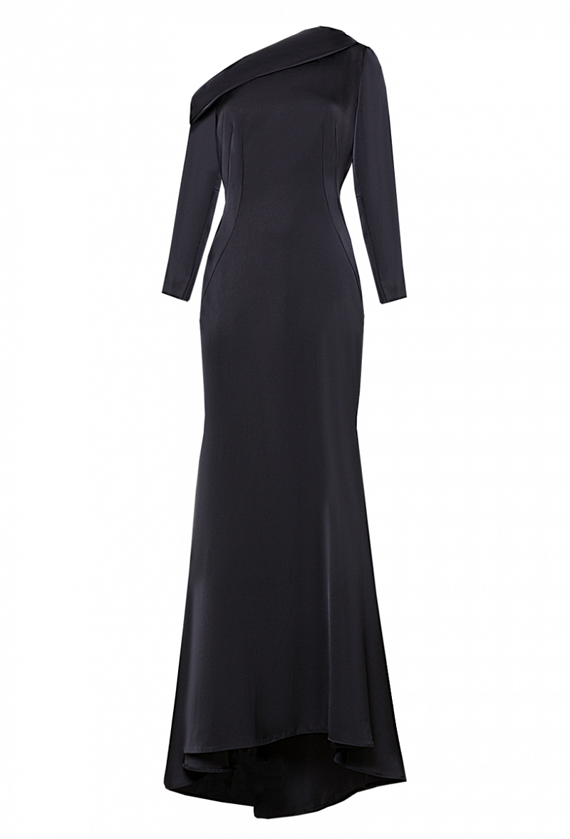 Платье шелковое силуэт «рыбка», длина «макси», с длинными рукавами, правое плечо открыто.