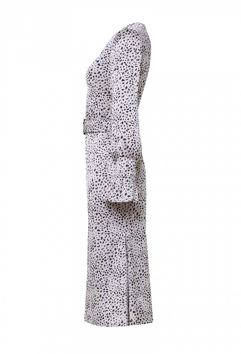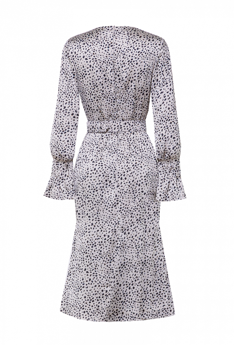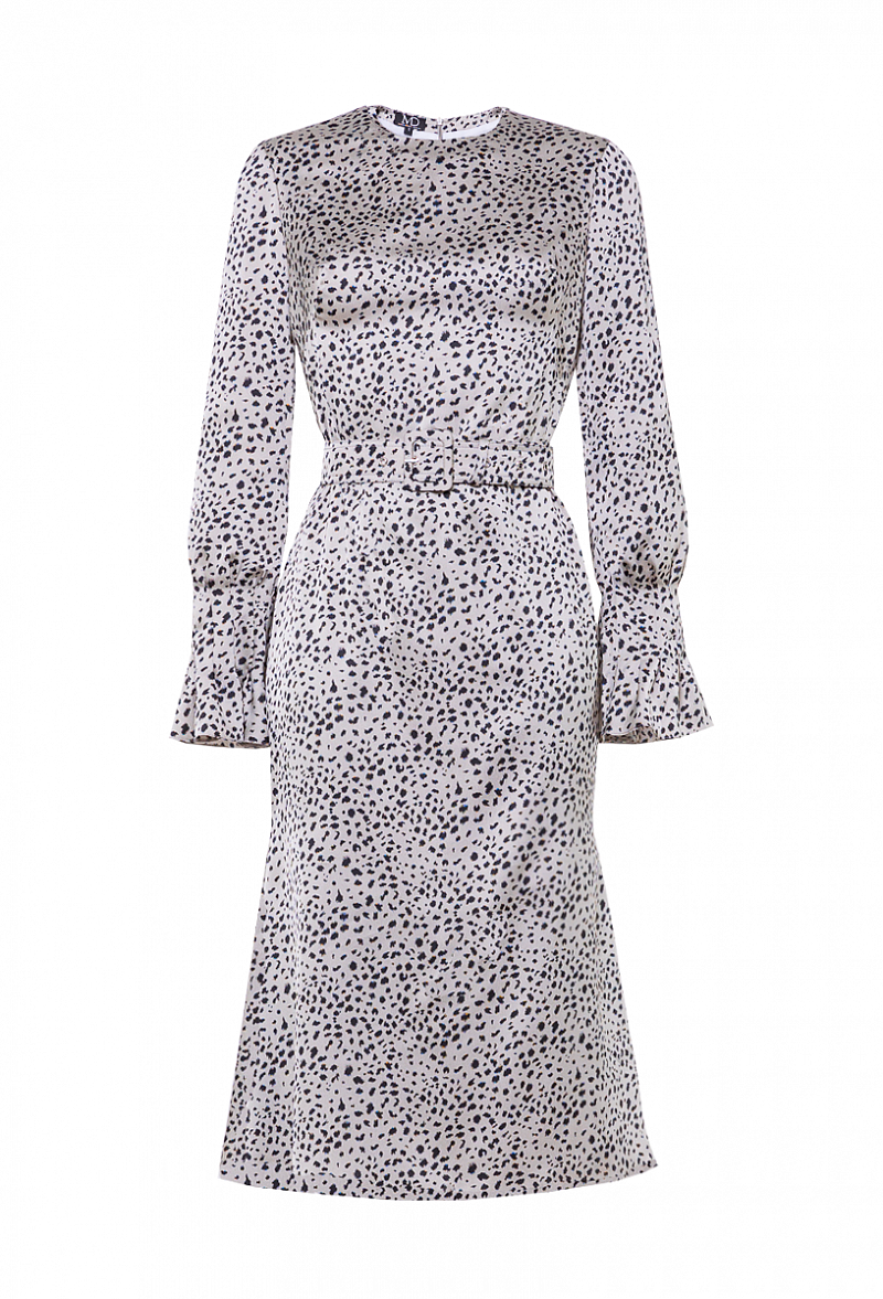 Платье шёлковое, отрезное по талии, юбка-годе, на рукавах сформированы вытачки-складки, образующие манжет с воланами.