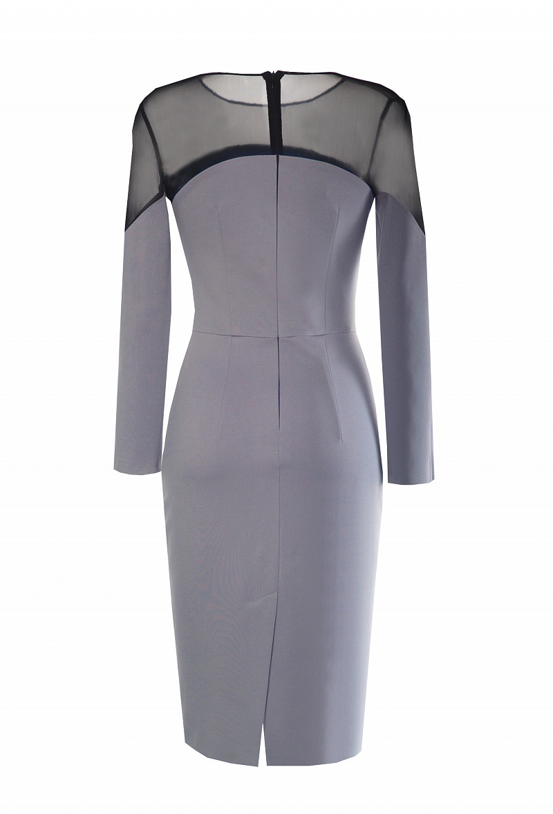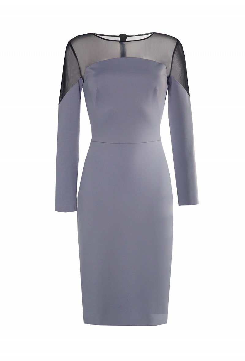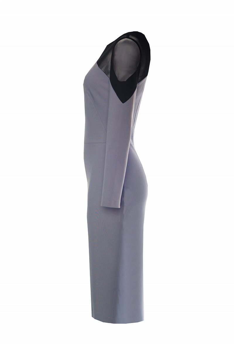 Платье футляр длины миди, отрезное по талии с графической трикотажной кокеткой, переходящей на рукава, выполненной в форме полукруга.