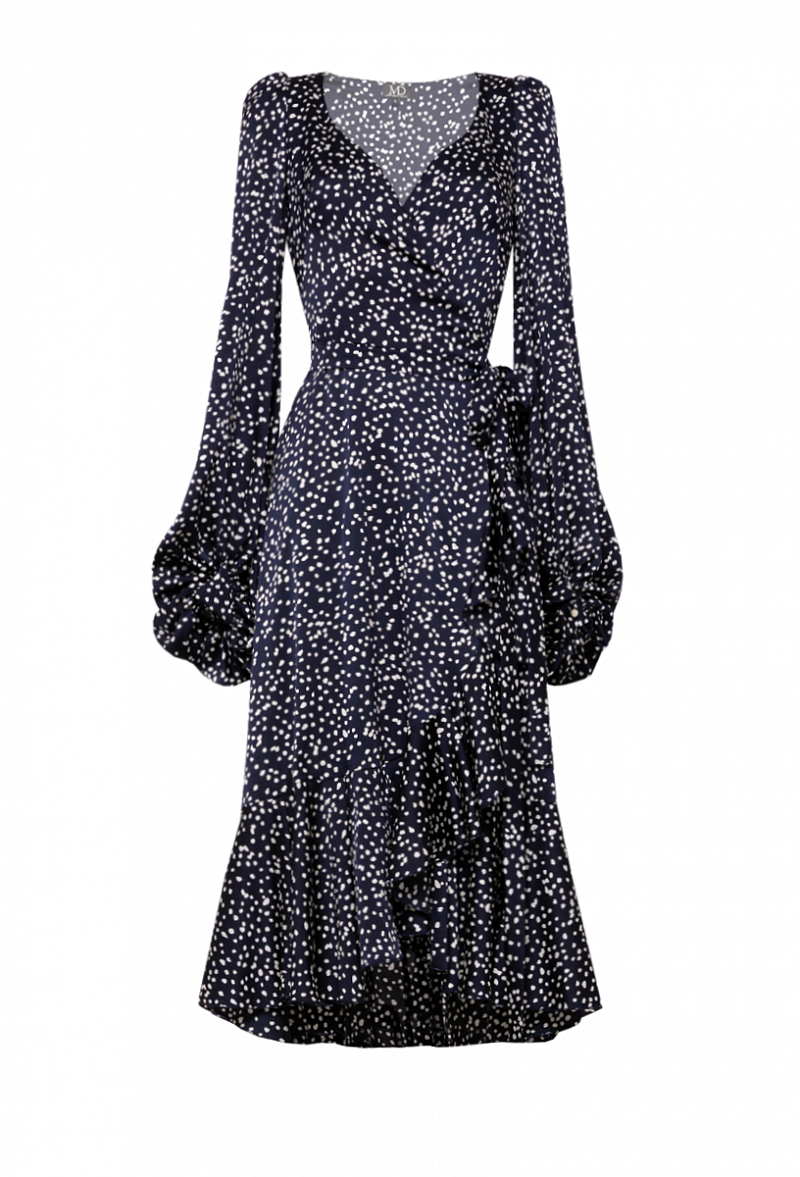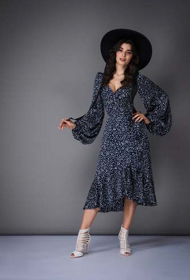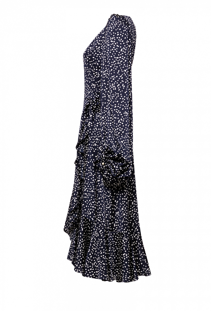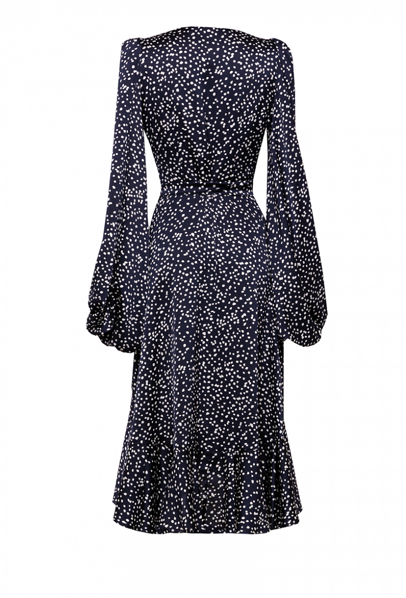 Платье облегающее с запахом. С воланом по низу юбки, с длинными широкими рукавами на манжетах.