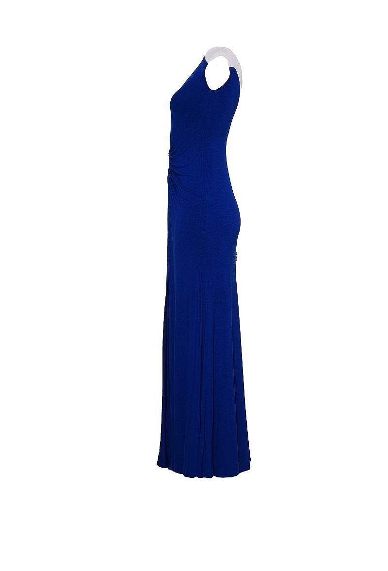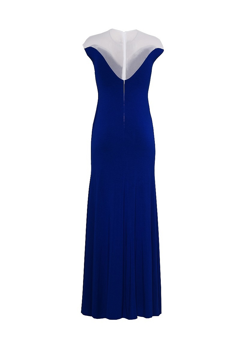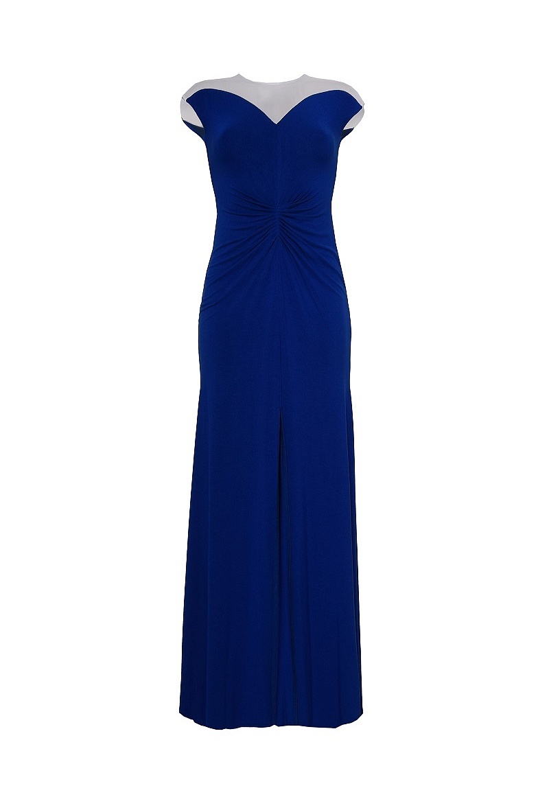Длинное платье из вискозы с опущенным рукавом, кокеткой из молочной сетки с защипами в районе талии и вырезом на юбке спереди.