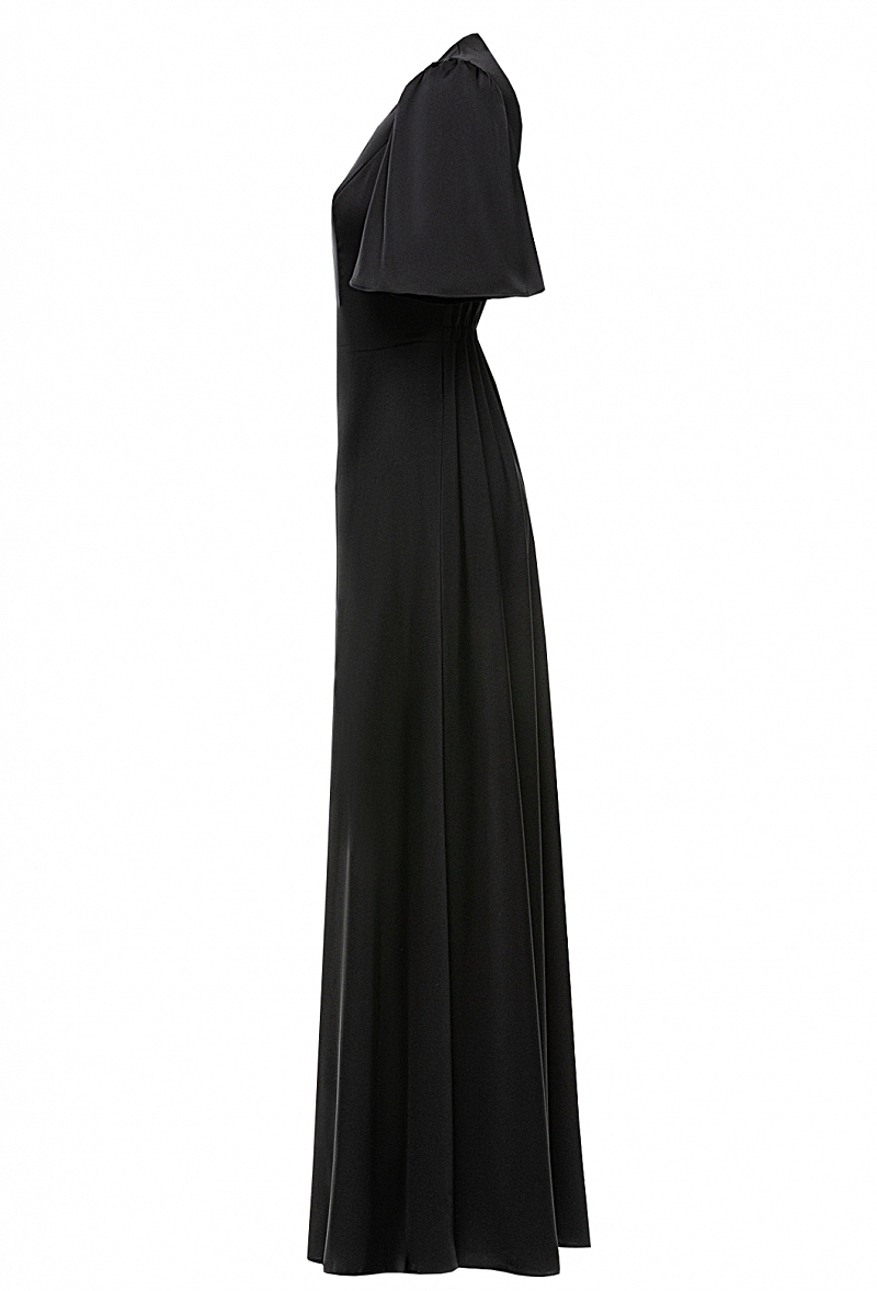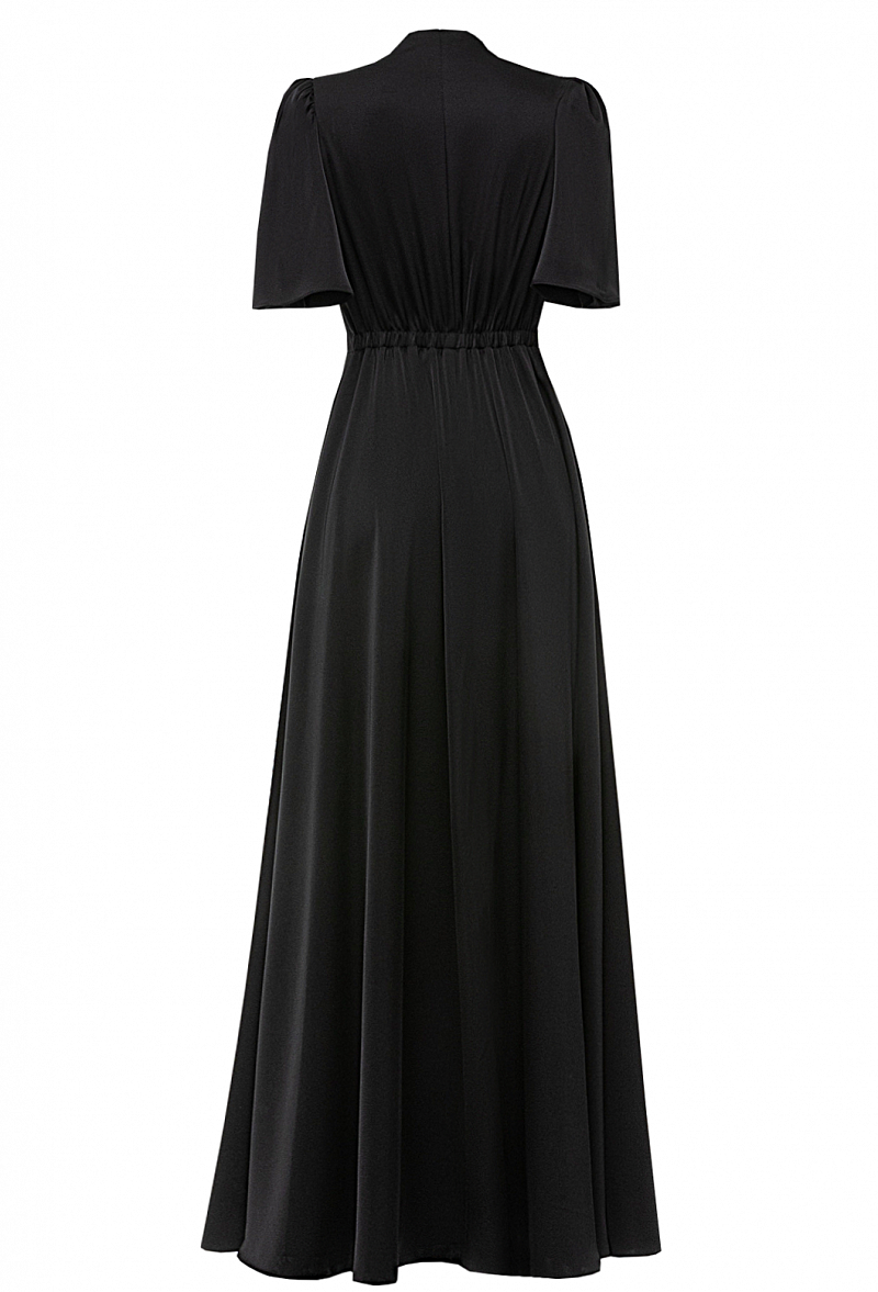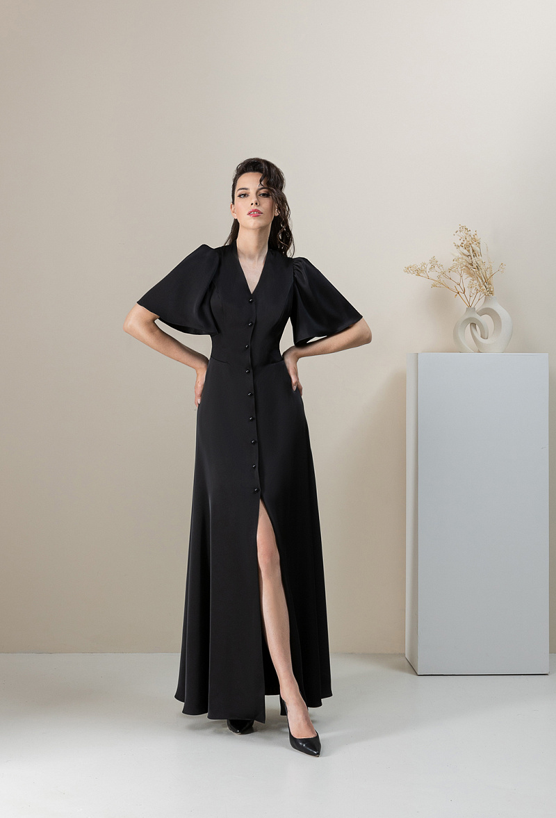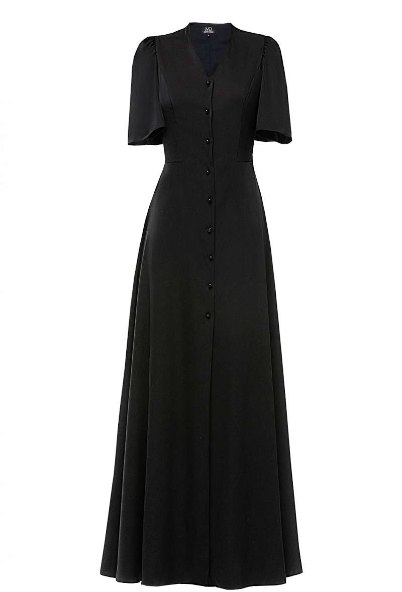 Платье в пол из легкой ткани на пуговицах. V-образный вырез, приталенное, с трапециевидной юбкой.