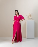 Платье в пол из легкой ткани на пуговицах. V-образный вырез, приталенное, с трапецевидной юбкой