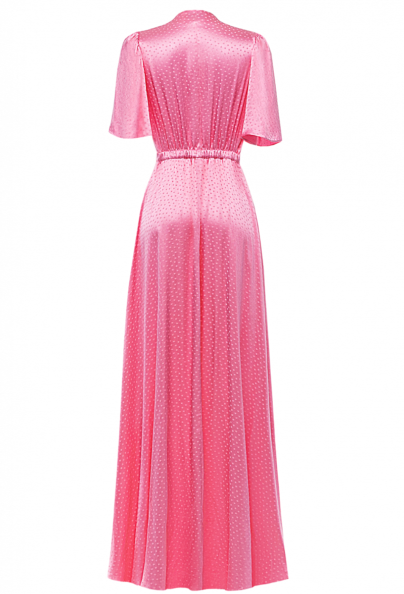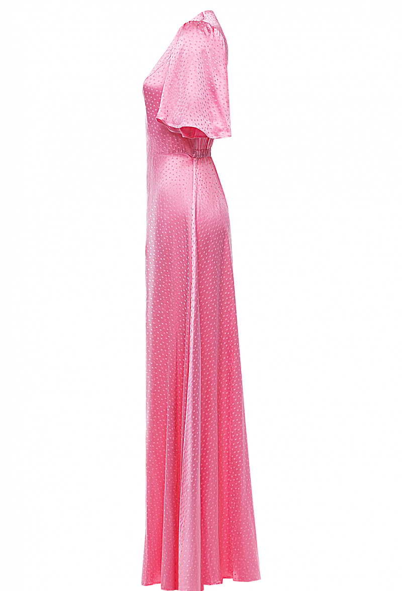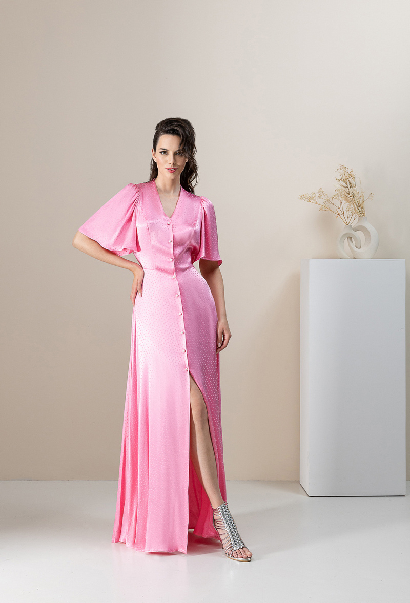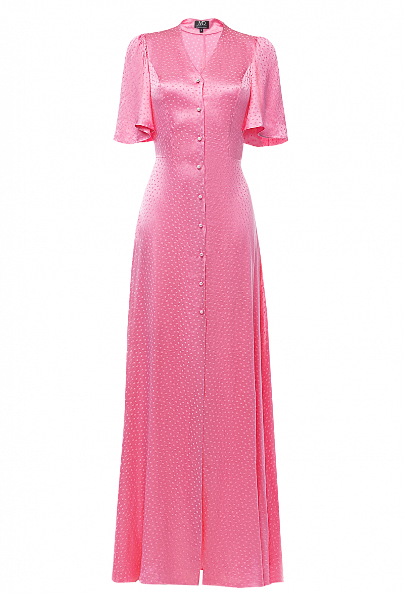 Платье в пол из легкой ткани на пуговицах. V-образный вырез, приталенное, с трапециевидной юбкой.