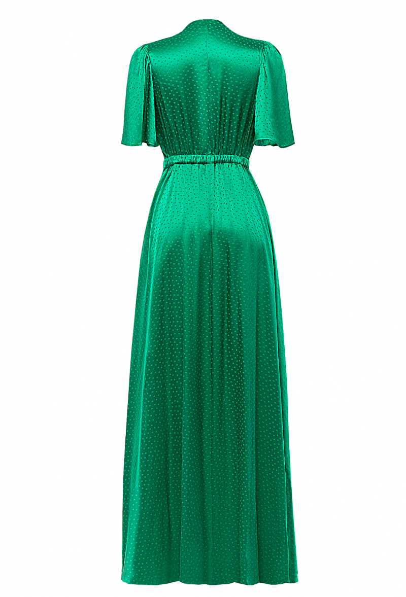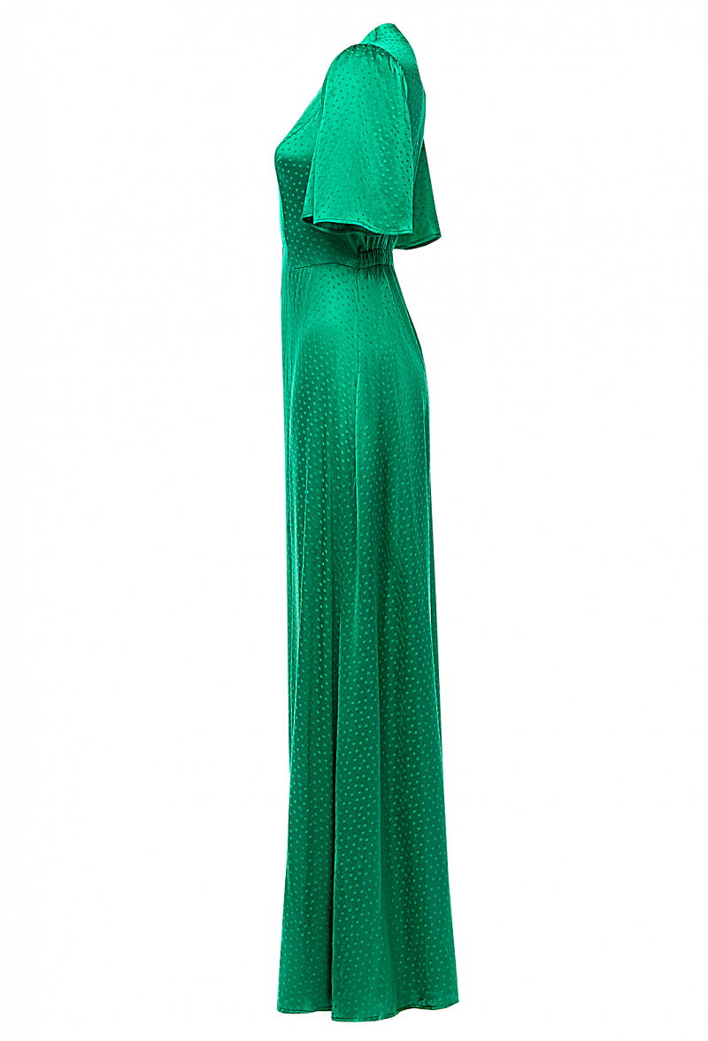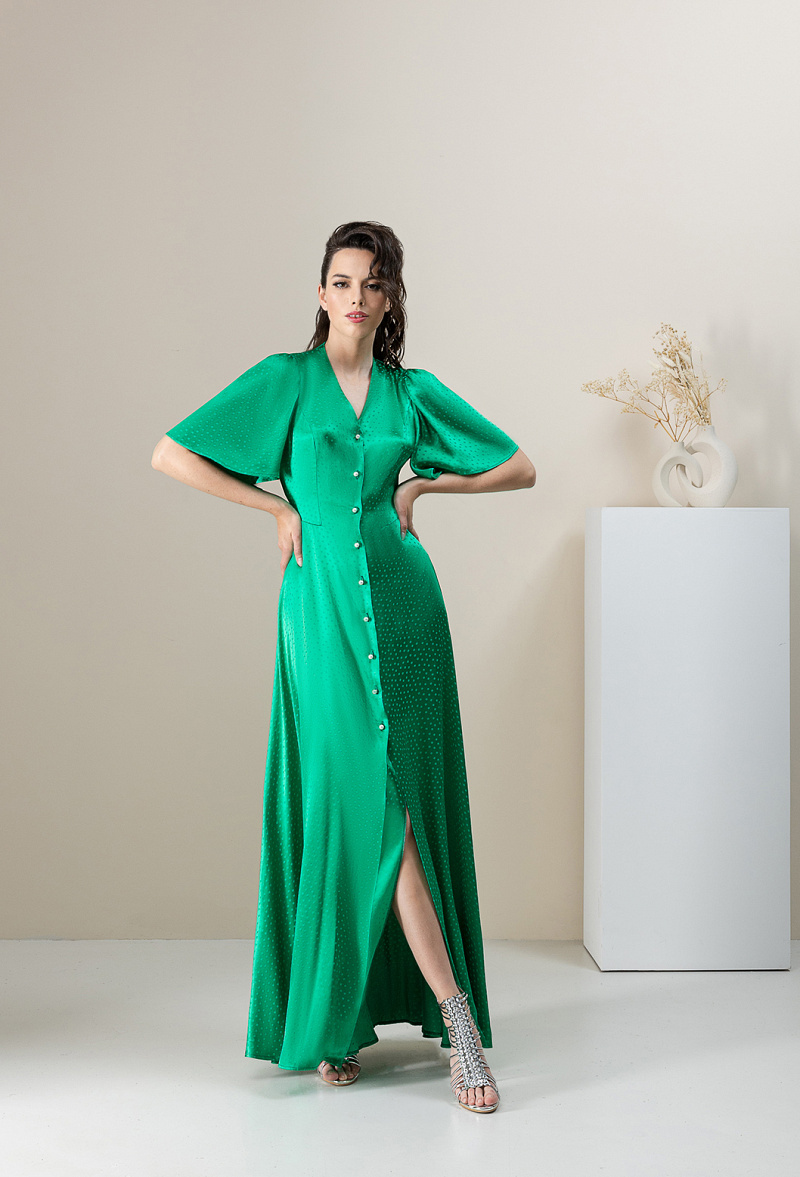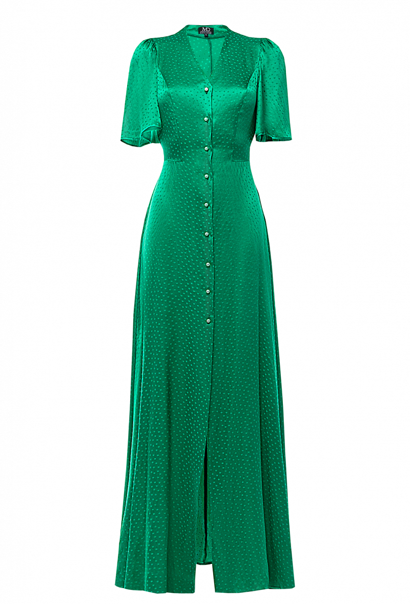 Платье в пол из легкой ткани на пуговицах. V-образный вырез, приталенное, с трапециевидной юбкой.