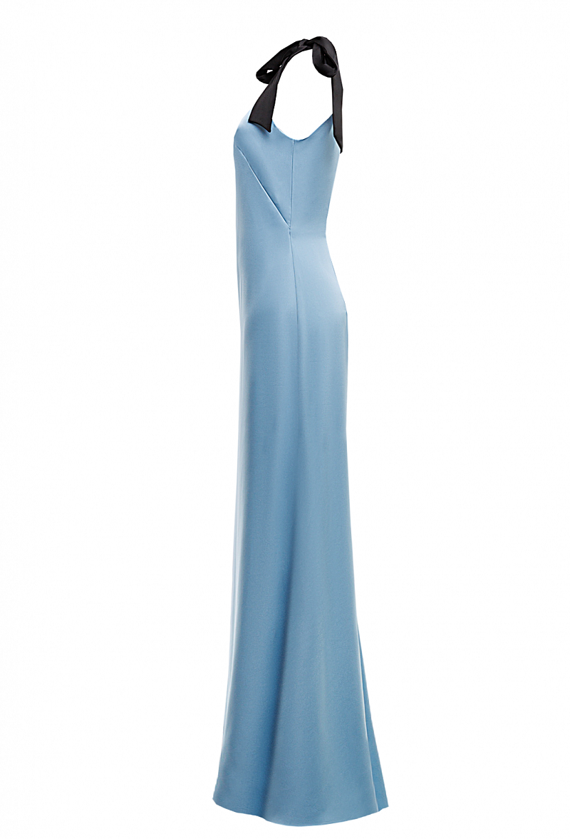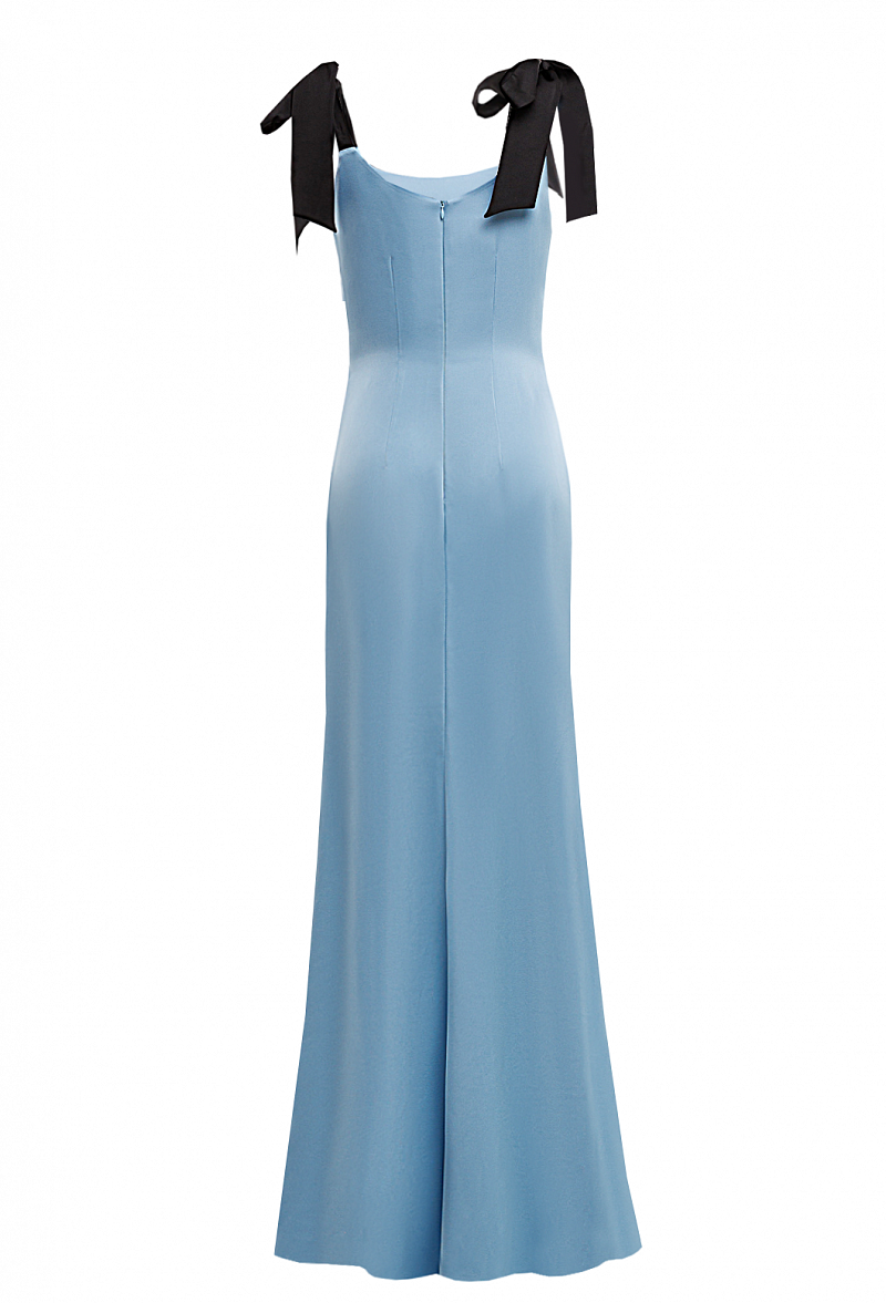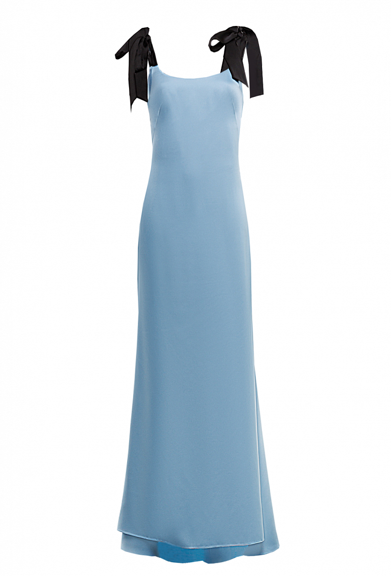 Платье в пол, приталенного силуэта, расклешенное книзу. Сзади застежка молния. На плечах завязывается черными лентами переходящими в бант.