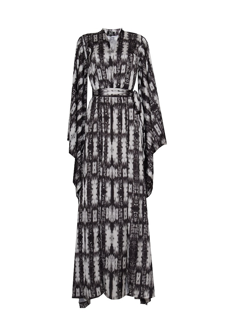 Платье в пол с оригинальными рукавами в стиле кимоно, воротником стойка, поясом и двумя разрезами спереди.