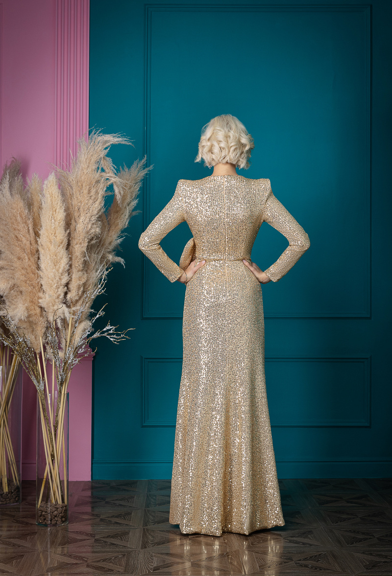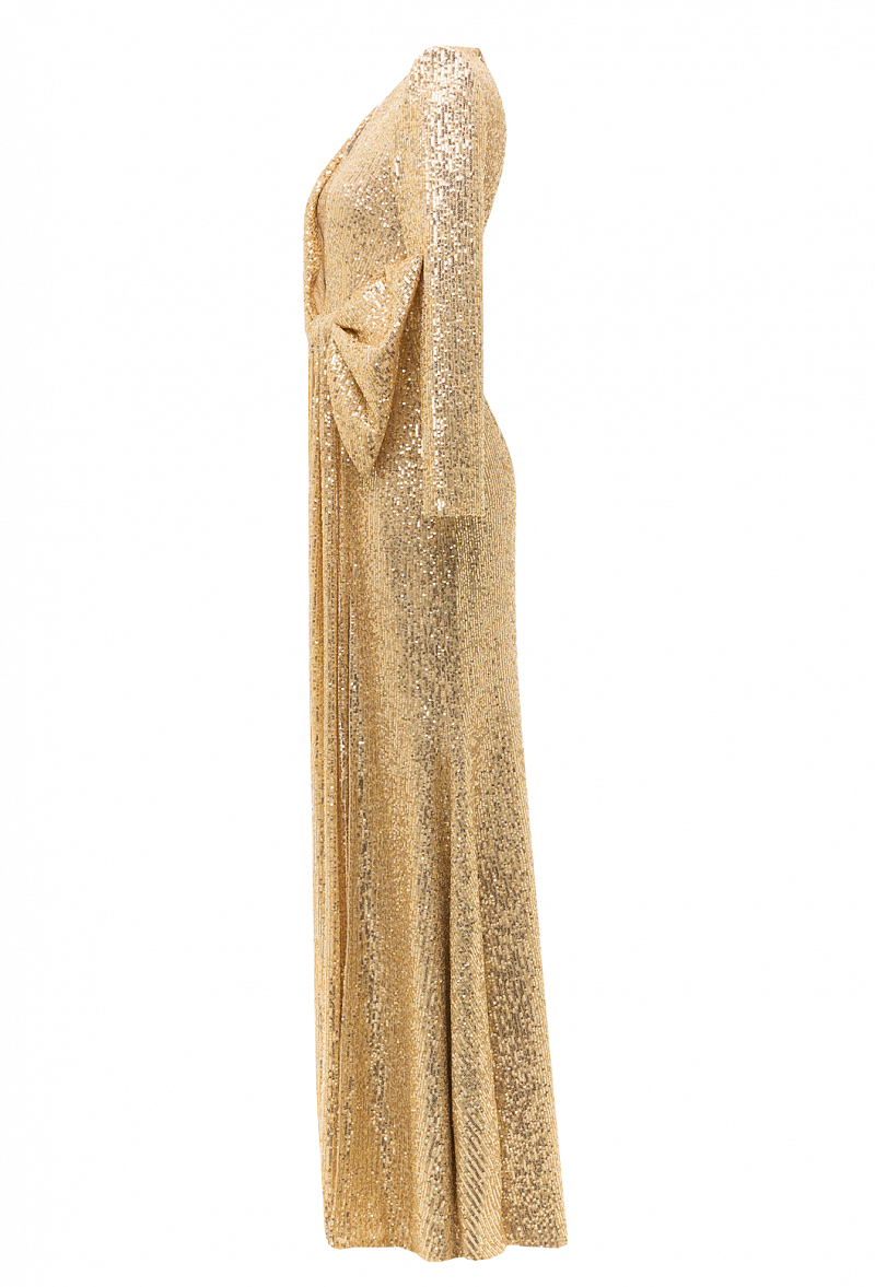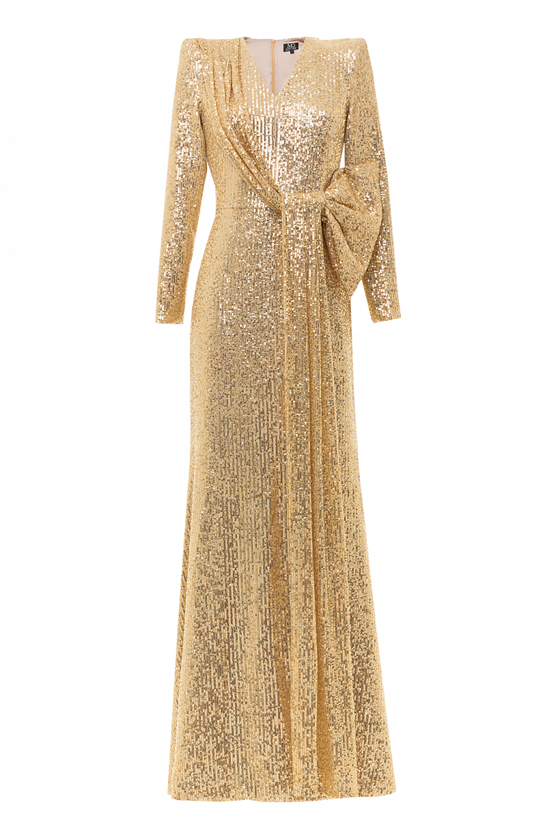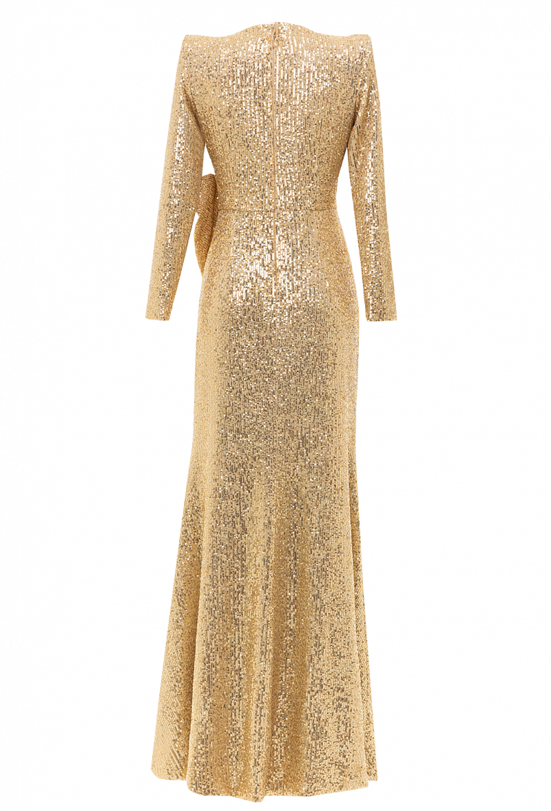 Платье в пол с пайетками и драпировкой в виде банта на талии.