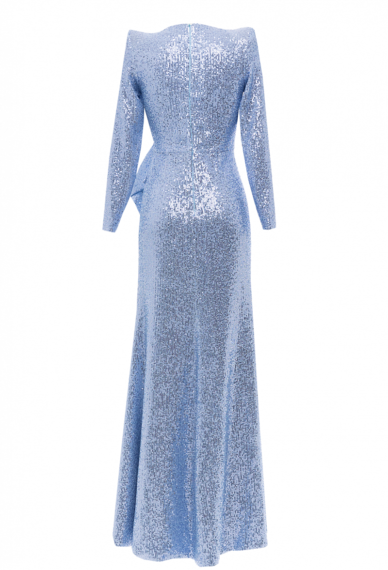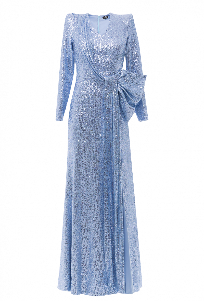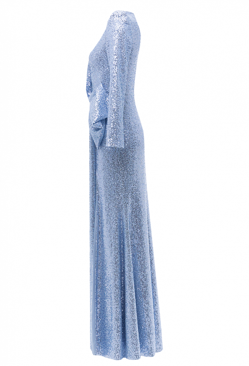 Платье в пол с пайетками и драпировкой в виде банта на талии.