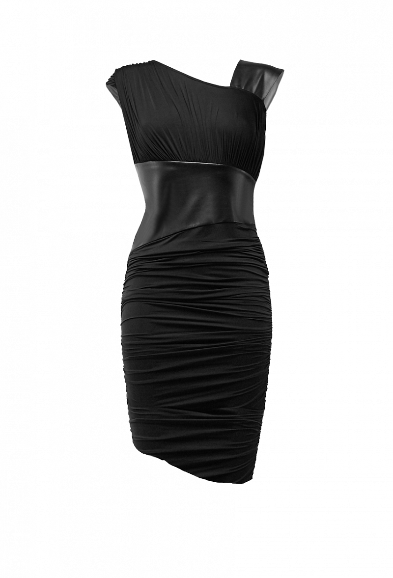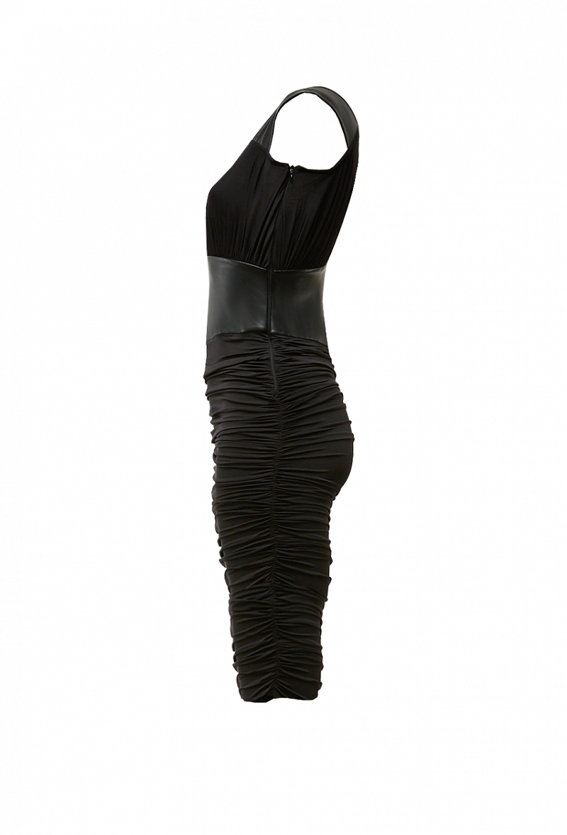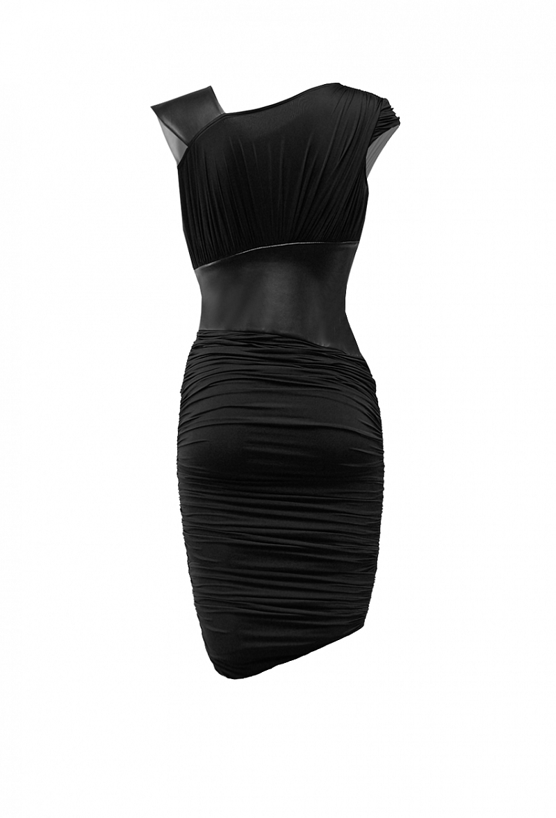 Платье в сборку с ассиметричным воротником, коротким рукавом и кокеткой из экокожи на талии