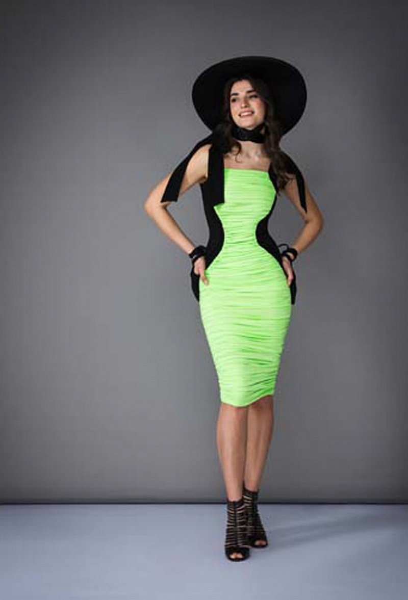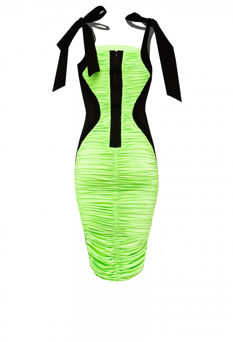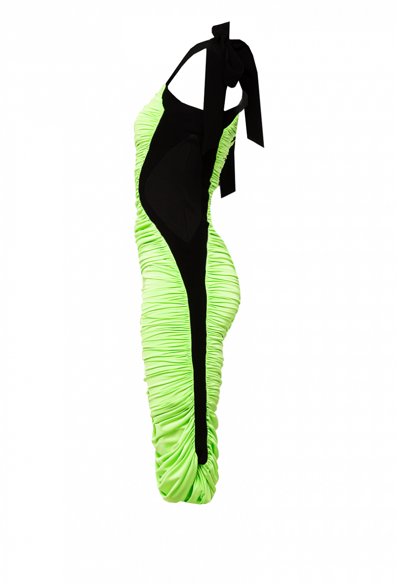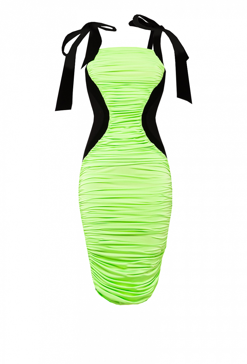 Платье в сборку с боковыми рельефами контрастного цвета.