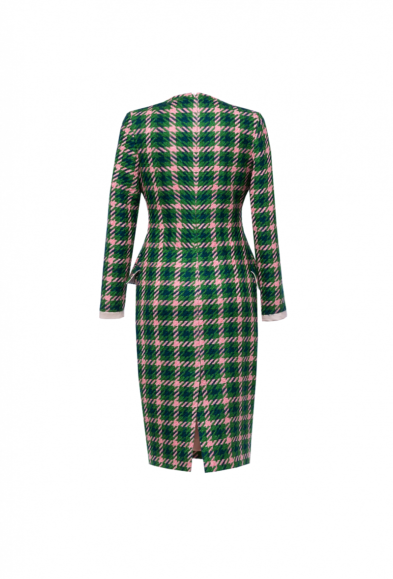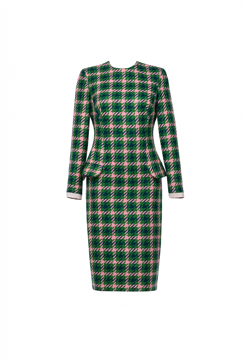 Полуприлегающее твидовое платье в клетку с шлицей сзади. Прорезные карманы с клапанами. Рукава втачные с манжетами из экокожи.
