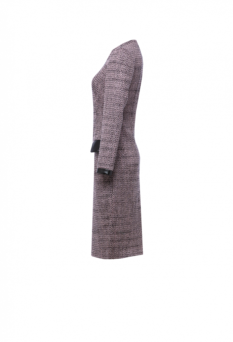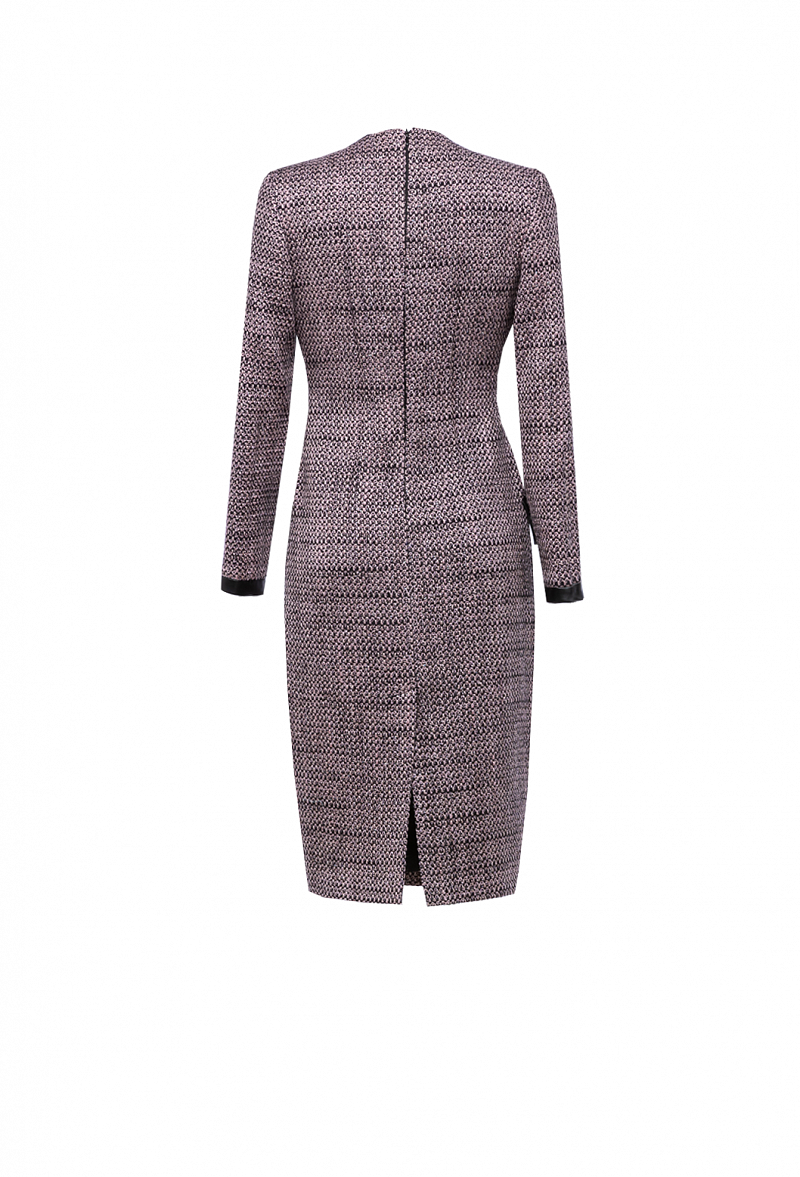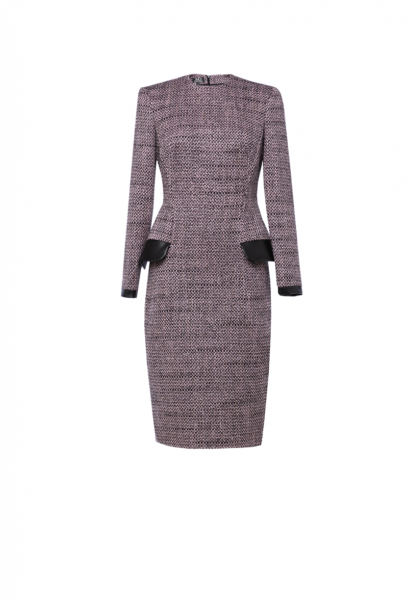 Полуприлегающее твидовое платье в клетку с шлицей сзади. Прорезные карманы с клапанами. Рукава втачные с манжетами из экокожи.