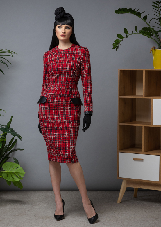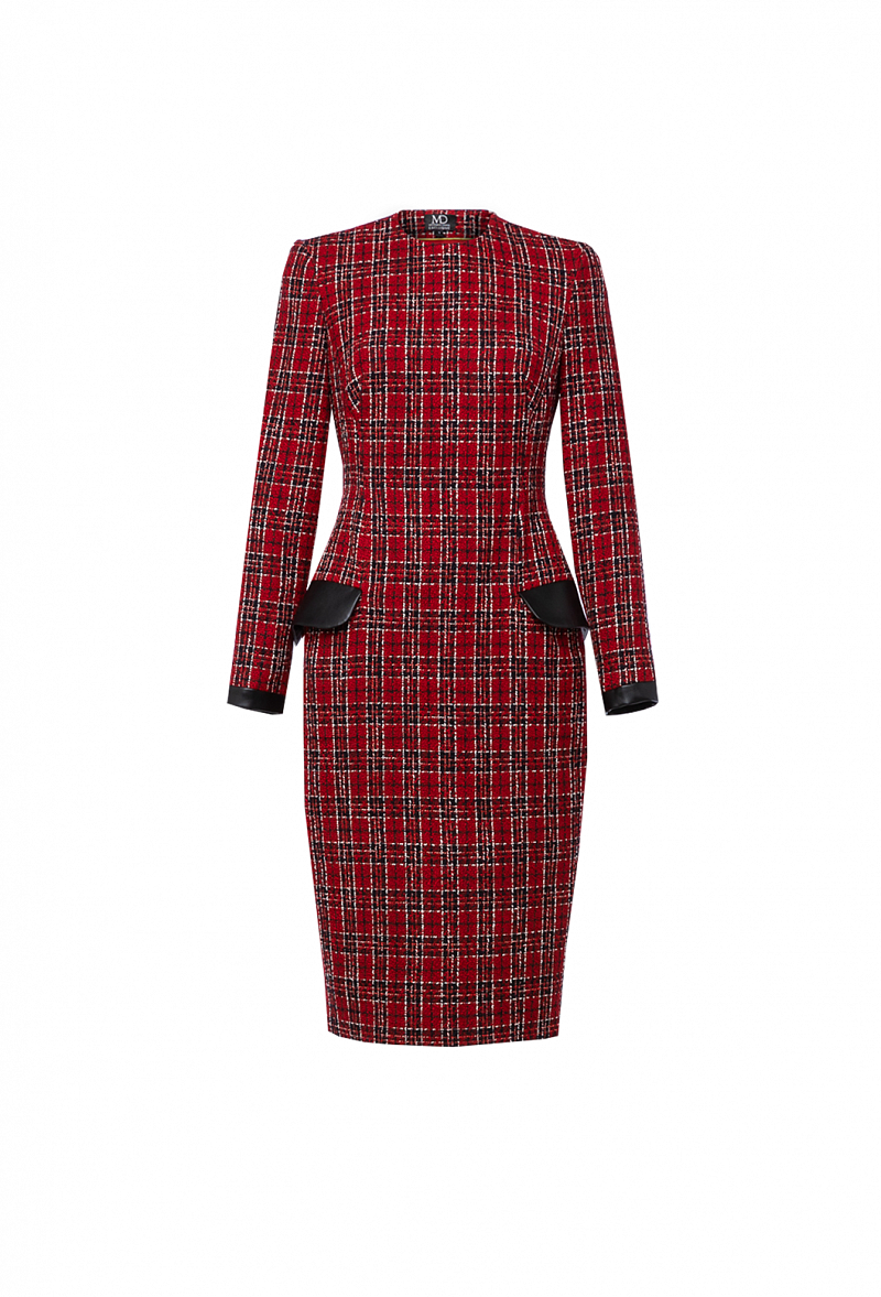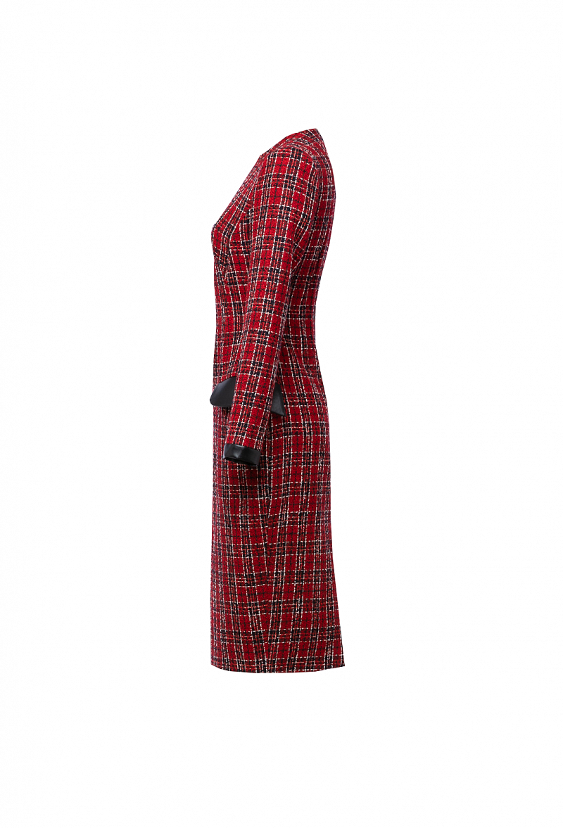 Полуприлегающее твидовое платье в клетку с шлицей сзади. Прорезные карманы с клапанами. Рукава втачные с манжетами из экокожи.