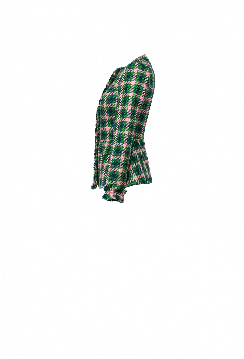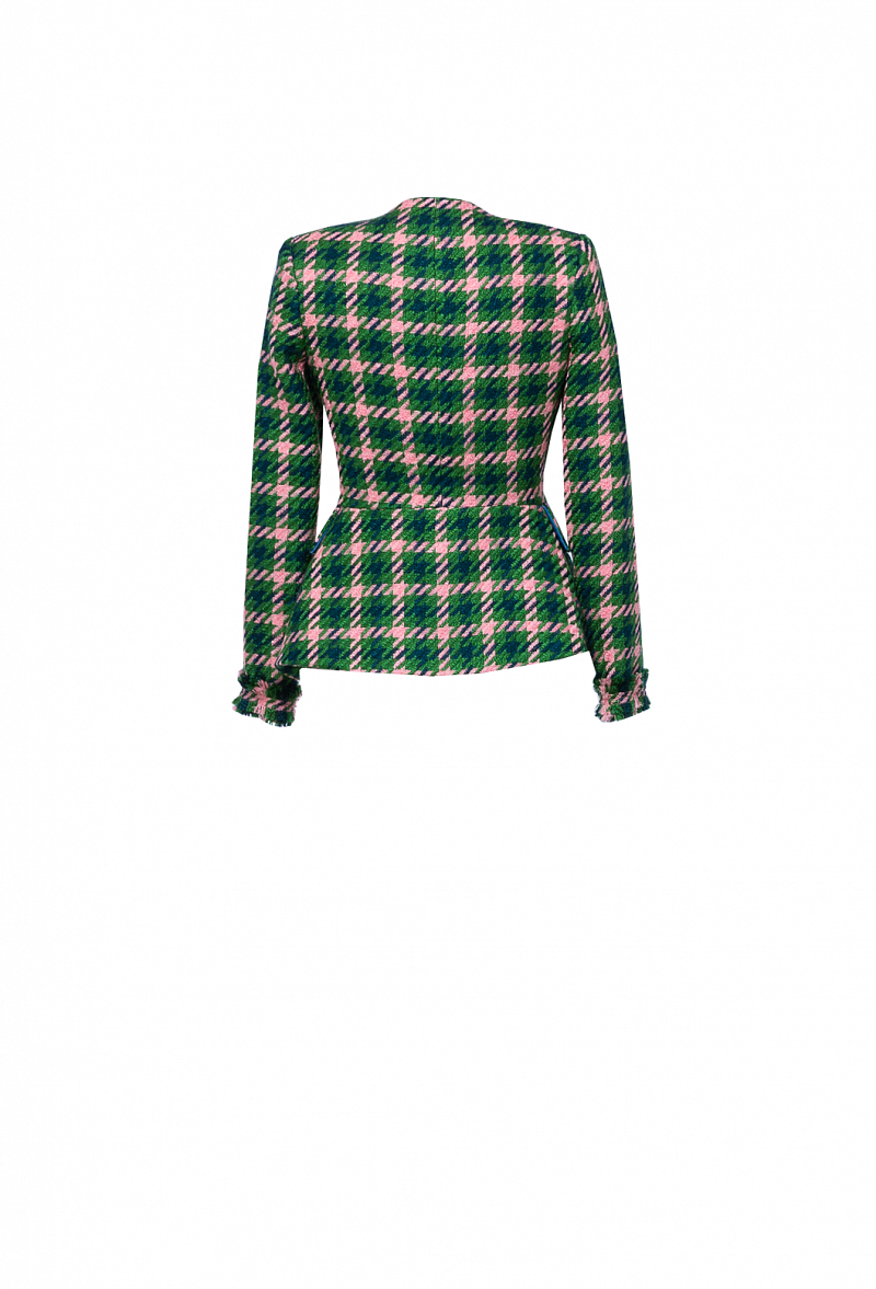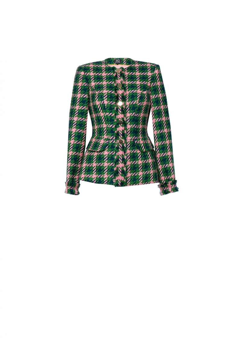 Приталенный твидовый жакет в клетку на кнопках с золотыми декоративными пуговицами по планке с бахромой в цвет.