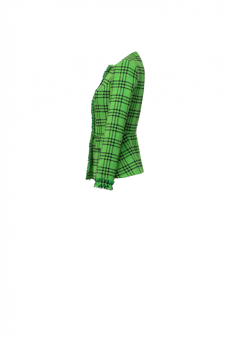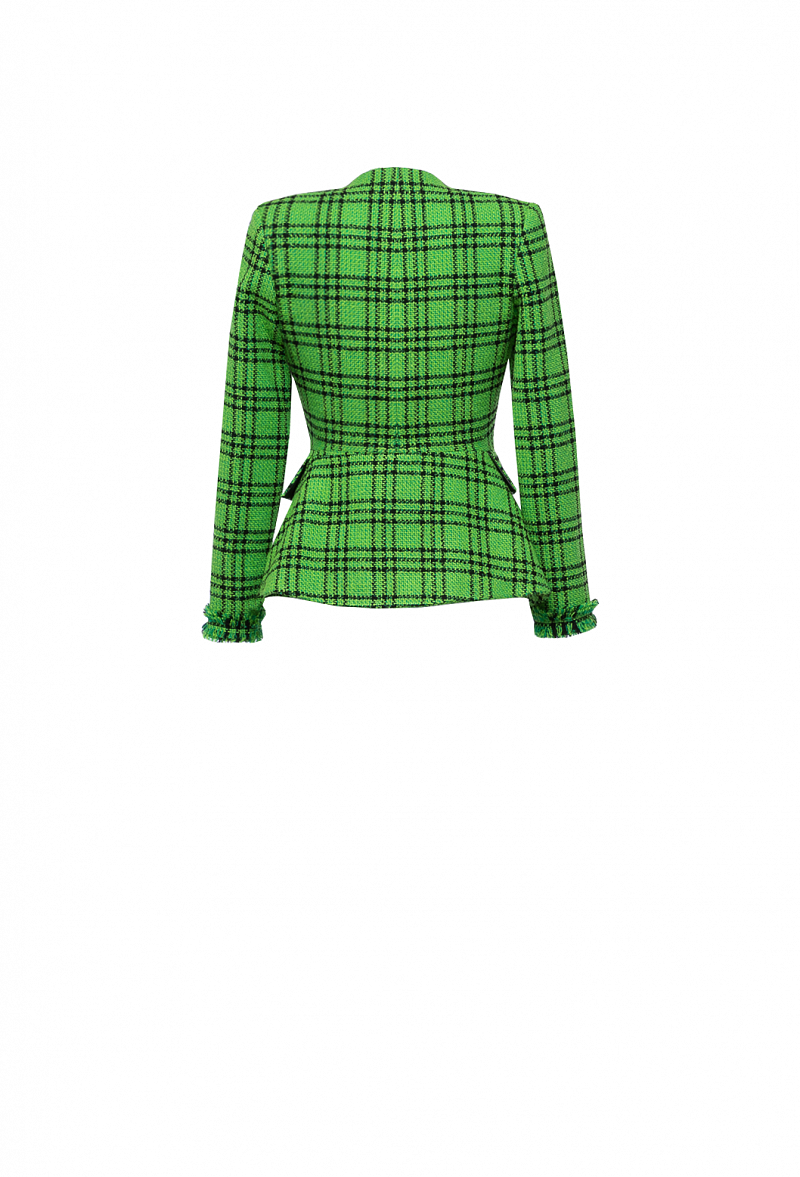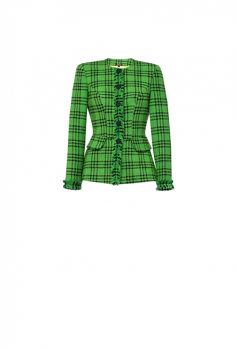 Приталенный твидовый жакет в клетку на кнопках с золотыми декоративными пуговицами по планке с бахромой в цвет.