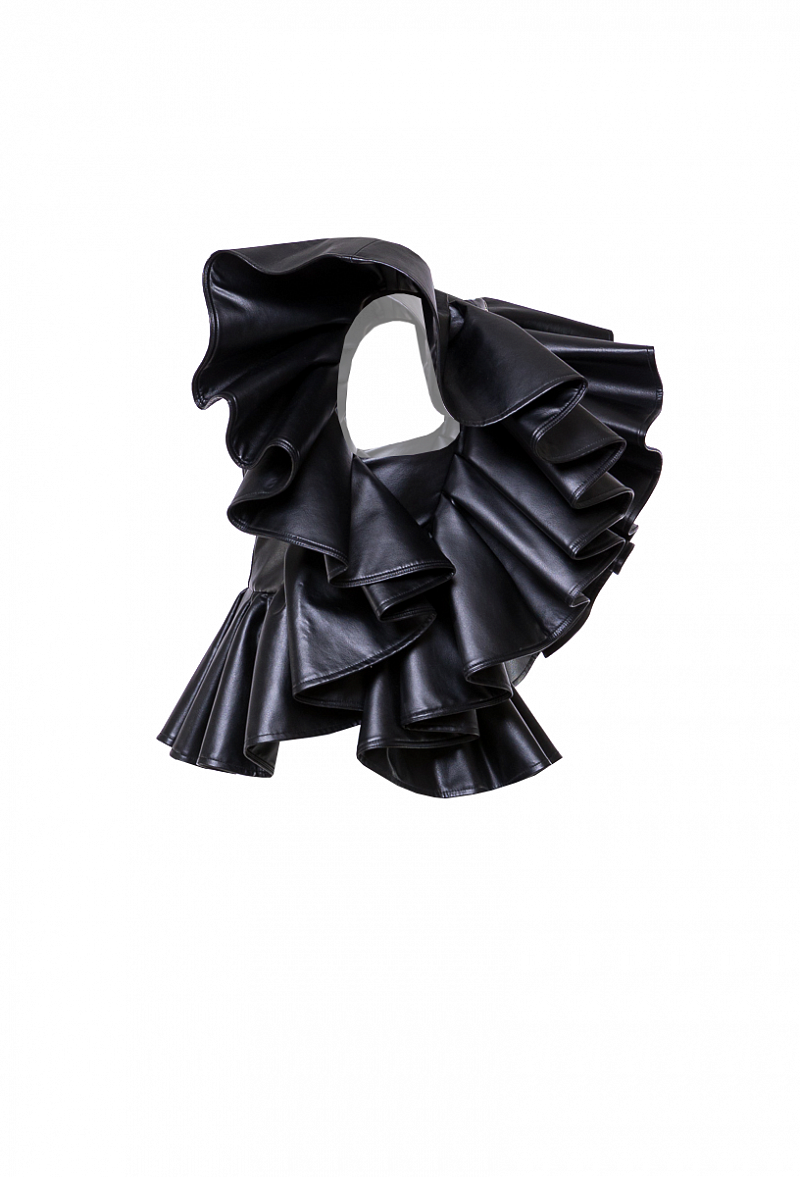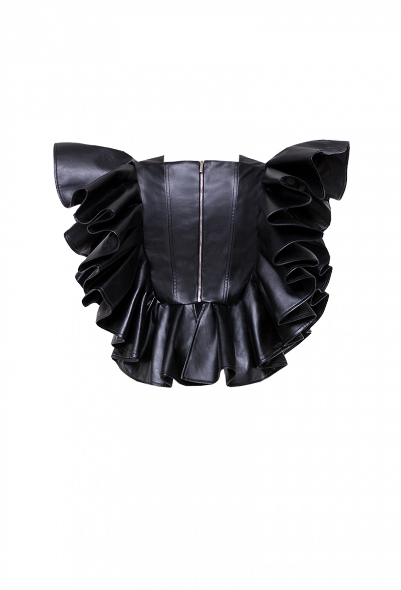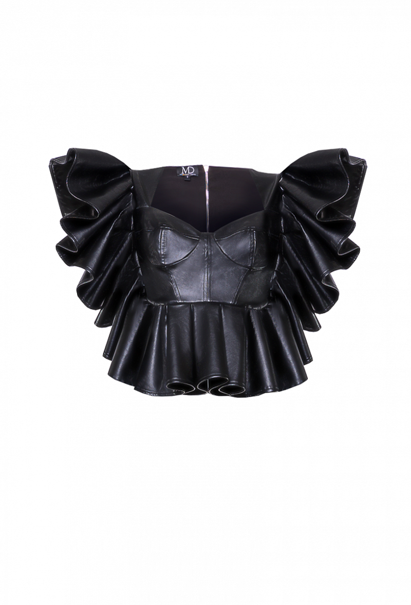 Топ приталенного силуэта, с отделкой в виде широких «воланов» по окату рукава и низу топа.