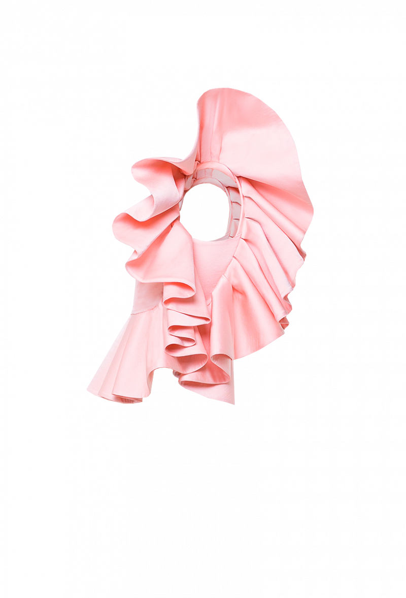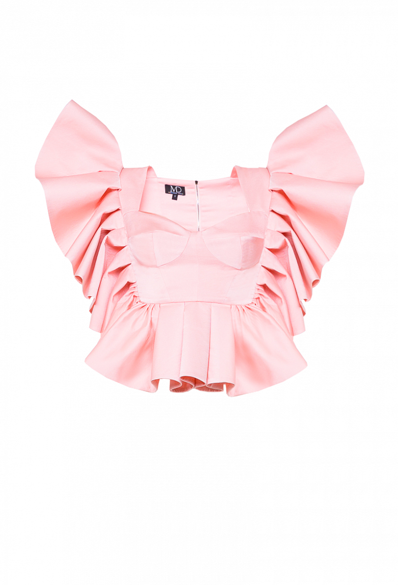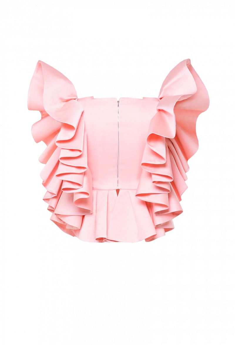 Топ приталенного силуэта, с отделкой в виде широких «воланов» по окату рукава и низу топа.