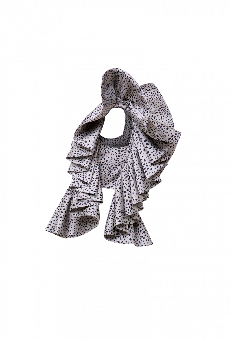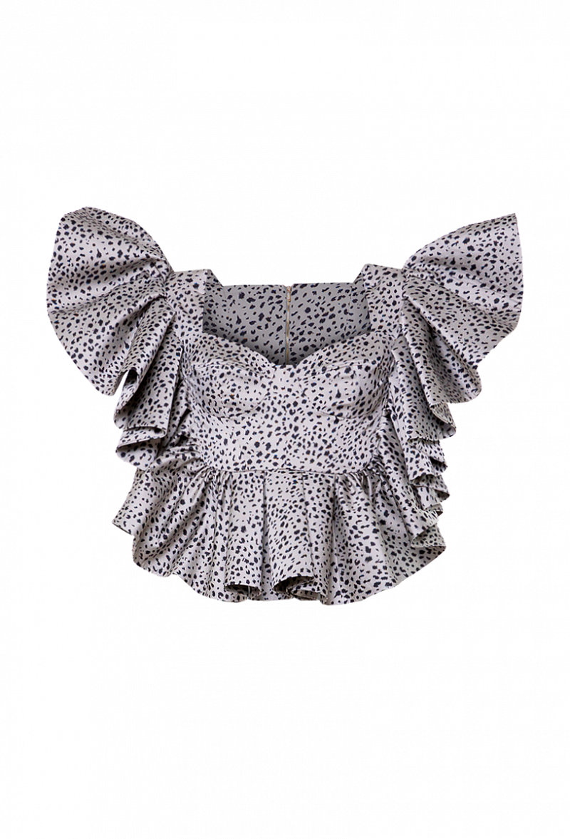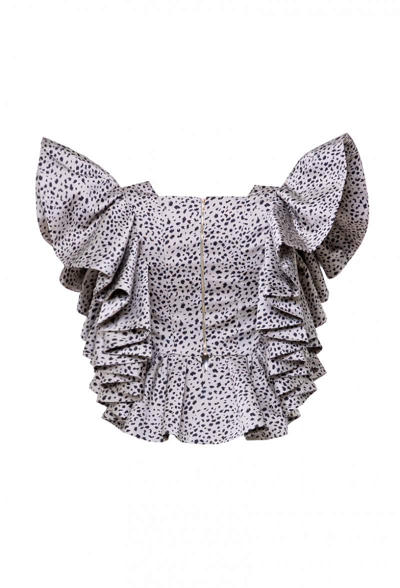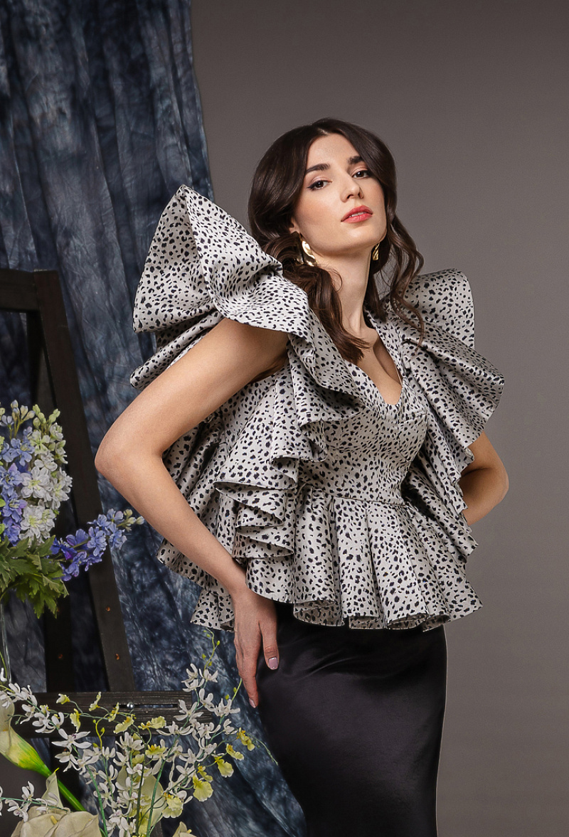 Топ приталенного силуэта, с отделкой в виде широких «воланов» по окату рукава и низу топа.